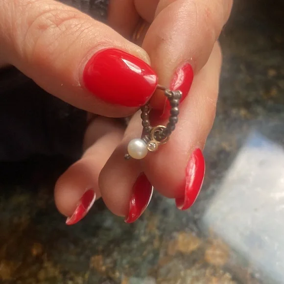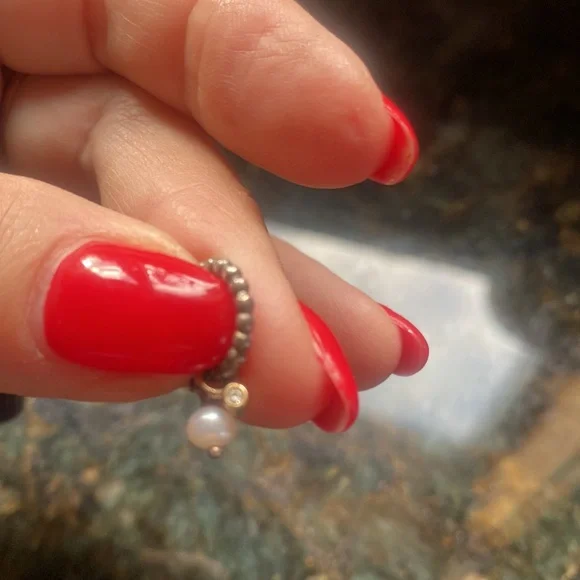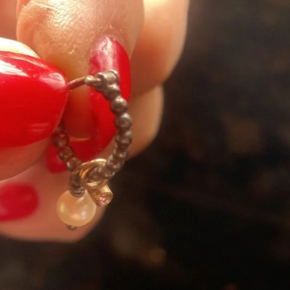 These elegant gold earrings feature a delicate pearl accent charm and a tiny, genuine diamond charm, set an 18 karat gold . perfect for adding a touch of sophistication to any outfit. The charms can be taken off and worn on a necklace and then you have a small hand crafted beaded sterling, silver hoop.. these were purchased at Alan Bilzarian,Boston