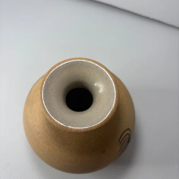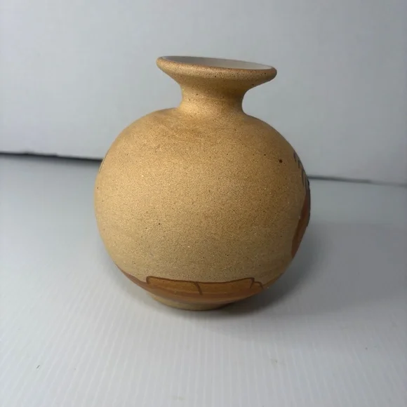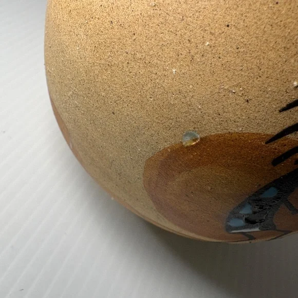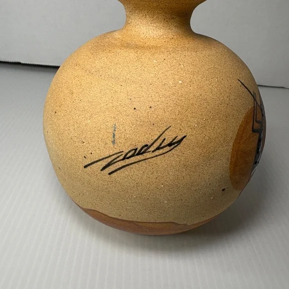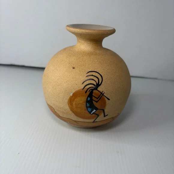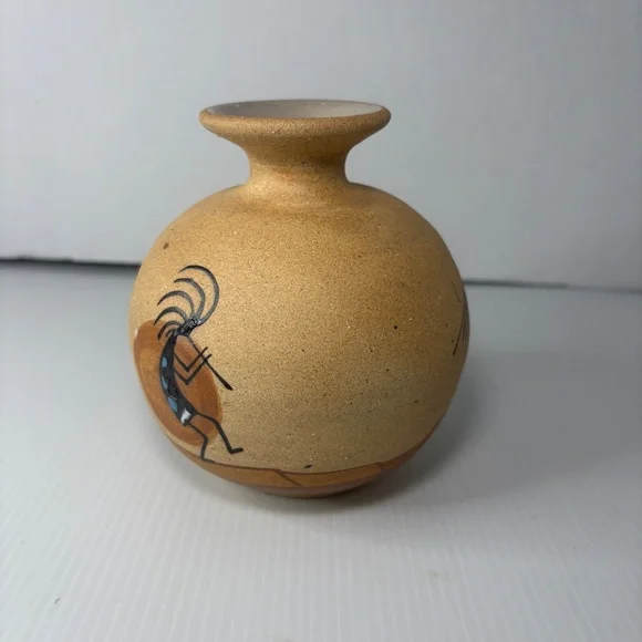 The product is a vintage Native American pottery vase featuring a depiction of the Kokopelli fertility figure, which holds cultural significance for Native American tribes such as the Navajo. The vase is handmade in the United States and has the signature of the artist who crafted it. It is about 5 1/2 inches high. This collectible piece showcases the unique artistry and craftsmanship of Native American pottery, making it a valuable addition to any collection of cultural artifacts.This item is vintage it has no chips or cracks. There are a few marks and a spot where sand is missing. Please view all photographs prior to purchasing.