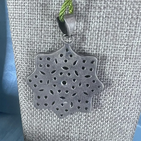 Elegant peridote gemstone pendant with an intricate design. Set in Bali sterling silver. Birthstone for August. Each stone will vary in color and imperfections in the stone may also vary. Lighting may vary as well. ***PLEASE NOTE when purchasing items:- Semiprecious stones are natural and it is common for imperfections and an uneven surface and may have a variety of colors. - Colors also may vary in lighting. - Finally, external flaws that might be found in a gemstone include blemishes, small chips, or scratches, while internal flaws may include fractures, or other crystal and mineral deposits as inclusions that formed millions of years ago when the gem was formed. - Both the front and back of items are clearly shown during the live session. All sales are final, no returns or exchanges are accepted. Does not include display and necklace. Thank you for your purchase!