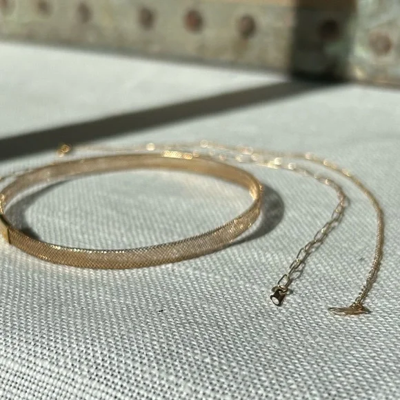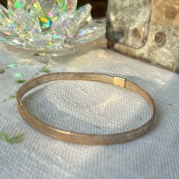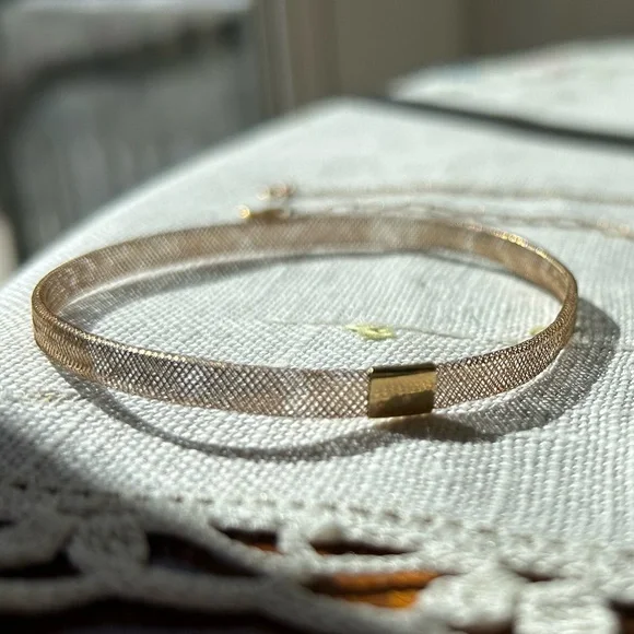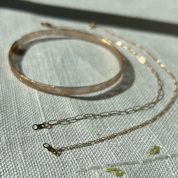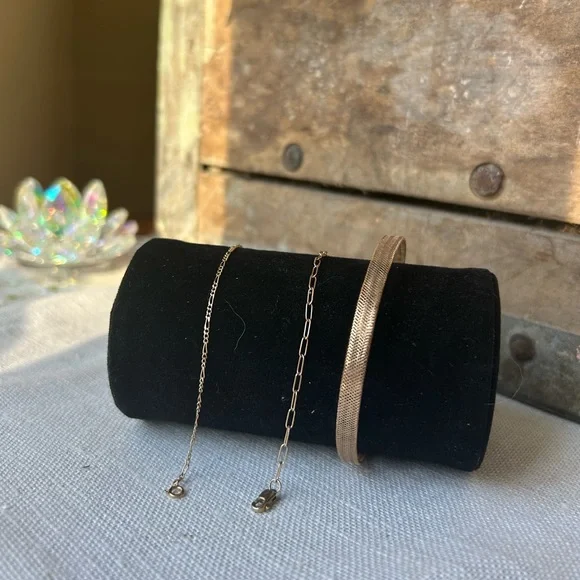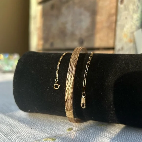 Stack em up! One stretch mesh bangle, one spring ring, and one paper clip chain with a lobster clasp. All very dainty and light. Each will fit a 7in wrist. All marked 14k for gold...