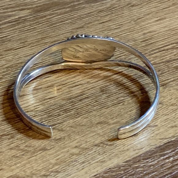 Vintage Kingman Turquoise and sterling silver cuff bracelet signed by Native American Navajo jewelry artist Justin Morris. Excellent craftsmanship and gorgeous style in this...
