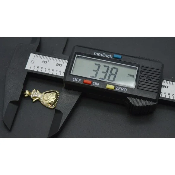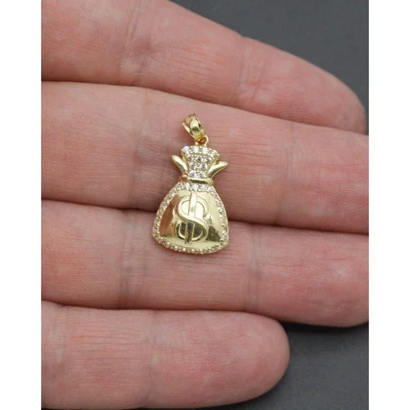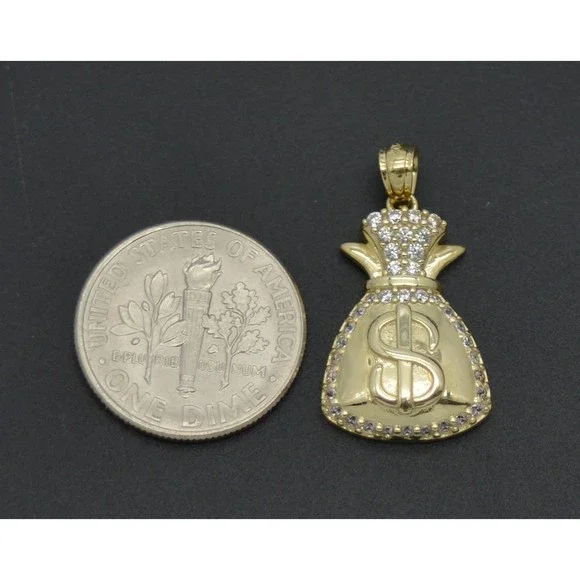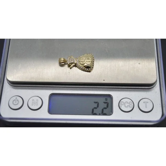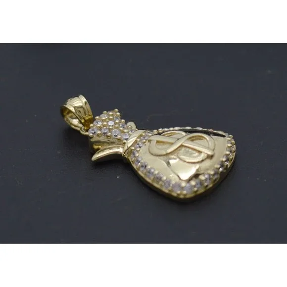 Real 10K Solid Yellow Gold Dollar Money Bag Textured CZ Charm Pendant 2.2grams