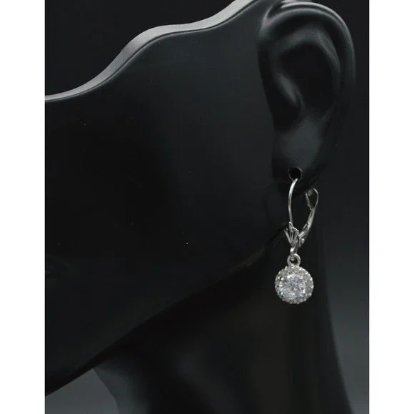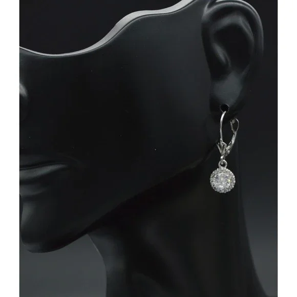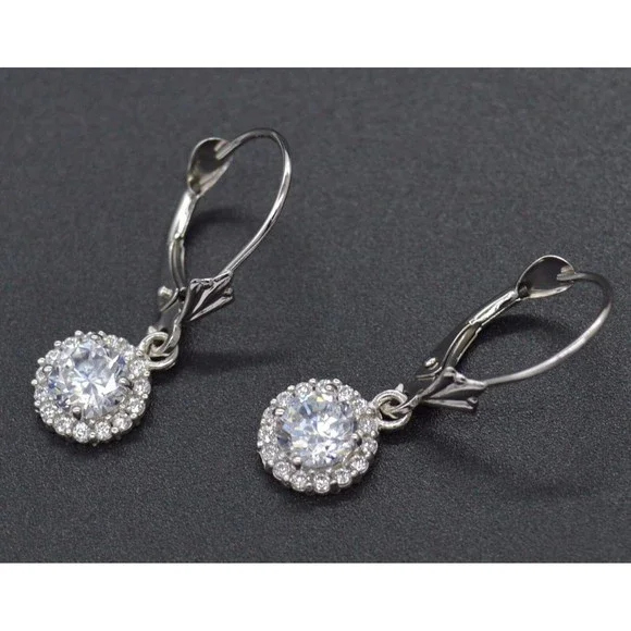 14K Solid White Gold White CZ Round Halo Leverback Earrings