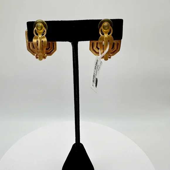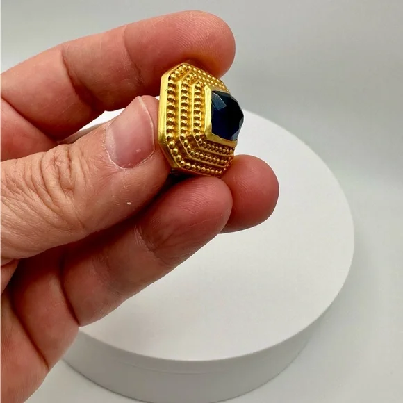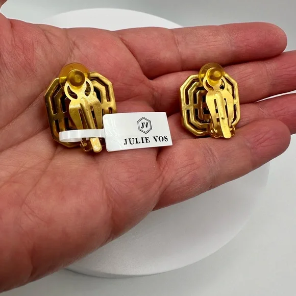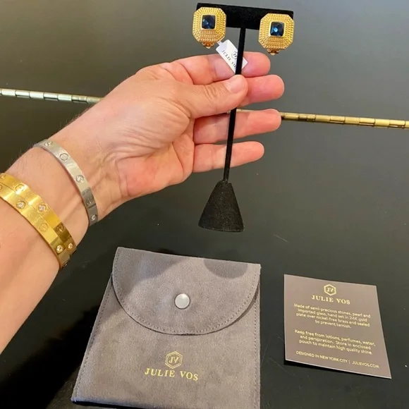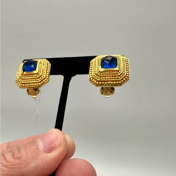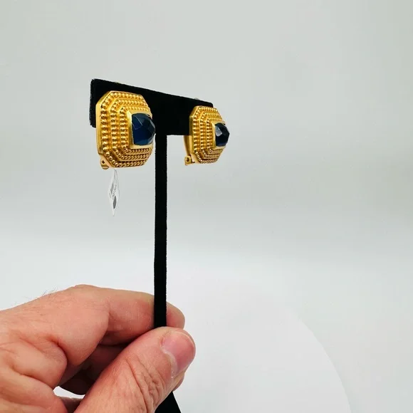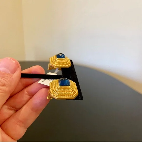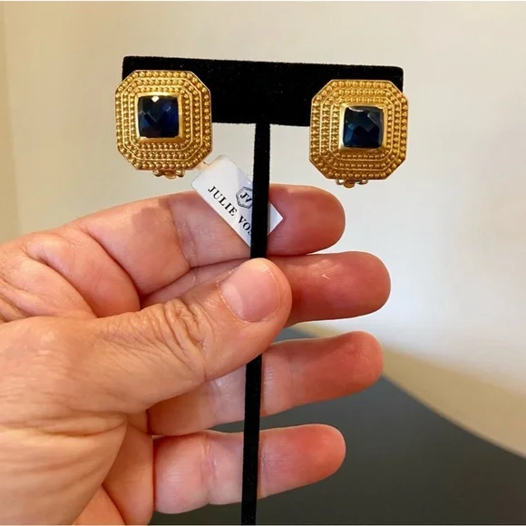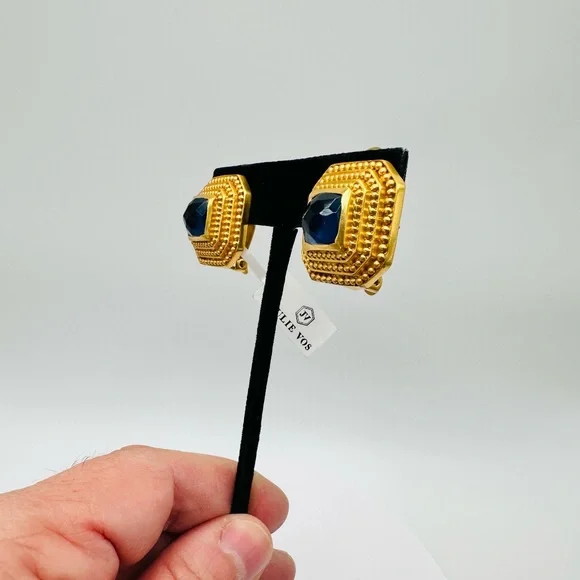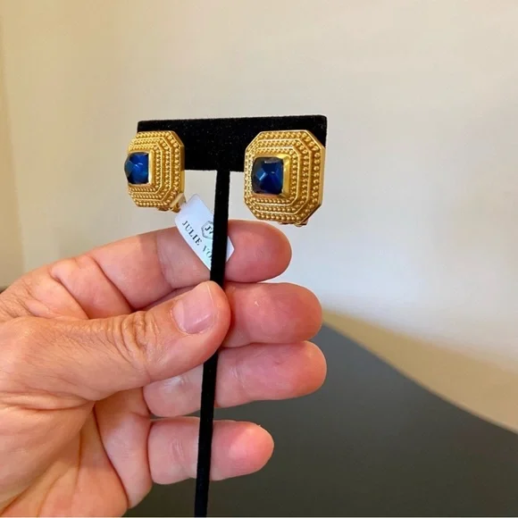 Authentic Luxury Julie Vos Sapphire Blue Clip Earrings-Perfect way to add sparkle to your life with these gorgeous earrings featuring luxurious radiant rose cut sapphire blue gemstones of imported glass-artfully faceted imported glass in Sapphire Blue surrounded by step rows of bead detail that add dimension to these earrings,the stones have beautiful color & sparkle in every light-SOLD OUT,JULIE VOS DOES NOT MAKE SAPPHIRE BLUE PIECES ANY LONGER which makes this piece VERY unique & rare, it’s a substantial piece-JV hallmark on back-24K gold plated over nickel free brass & sealed to prevent tarnish-clip on style, built in rubber discs for comfort, they have a yellow tint, I think they did that to go w/color of earrings-between .75” - 1” W-original Julie pouch & product info/care instructions included-JV pieces designed & HANDCRAFTED to standards of fine jewelry,each stone is unique & have own characteristics,same w/24k gold plated brass,any unique characteristics of stone, metal work, plating, because handcrafted, including minor surface scratches on metal or stones, pic of back of one of clips where minor surface scratches, same earring there is tiny spot on side where metal wasn’t cut smooth, how made, back of other earring where they missed tiny spots of plating, how made, in pics-gift w/purchase-SOLD OUT ONLINE