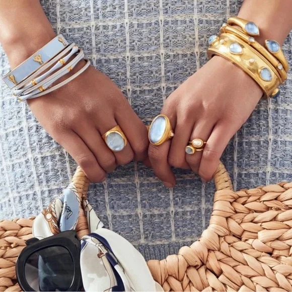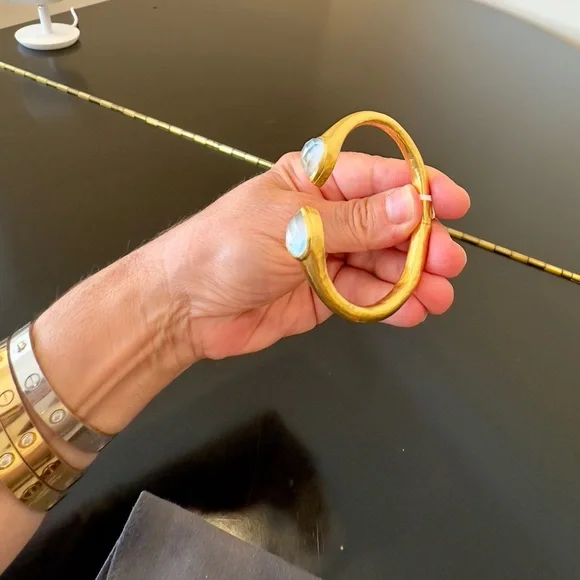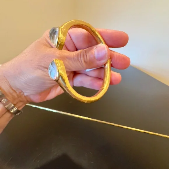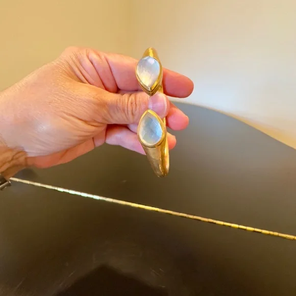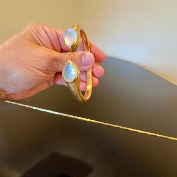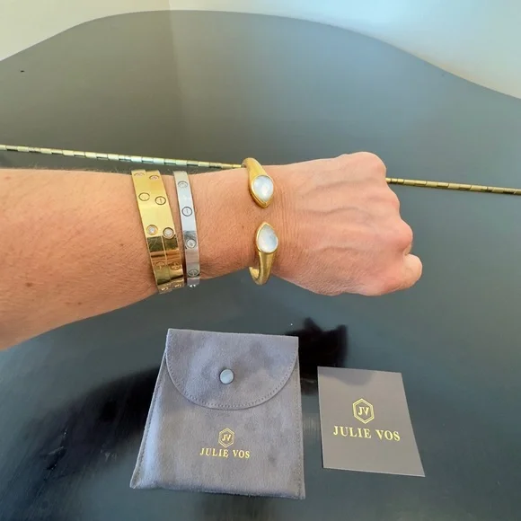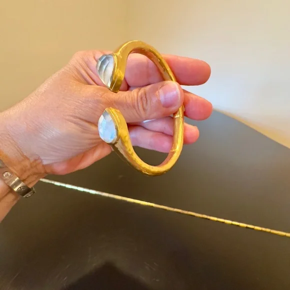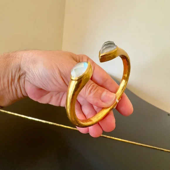 AUTHENTIC LUXURY MINIMALIST JULIE VOS IRIDESCENT CLEAR CRYSTAL HINGED CUFF/BRACELET-Shimmering precision cut pear-shaped faceted gemstones of imported rose-cut glass w/mother of pearl doublets on a luxuriously gilded/hammered cuff, look at how gemstones catch light at every angle creating different beautiful hues-perfect way to add sparkle to life,JV jewelry designed to be daily dose of luxury-set in 24k gold plate over nickel free brass,sealed to prevent tarnish-JV hallmark embossed on inside,small CZ next to it-hinged cuff,put on easily,customize size up to point-little under 2.5” across inside of cuff, gemstone in bezel setting little under .75” across-JV pieces designed & HANDCRAFTED to standards of fine jewelry, any unique characteristics of gemstones, metal work, plating, because meticulously handcrafted, metal work & plating difference,in pics, missed plating on some parts, in pics, edge of one gemstone not cut as smooth & makes it look like inclusion, in pics & video, hammered detail intentionally not exactly same everywhere, all how manufactured & purchased, I´m lowering price because there is more than usual unique char due to being handcrafted-orig JV pouch,product info/care instructions included-included stock pics of other colors & items, I’m selling ONE iridescent clear crystal cuff-look at pics & video as help describe item-gift w/purchase, will include more than one nice gift w/purchase-SOLD OUT ONLINE & IN STORES, RARE