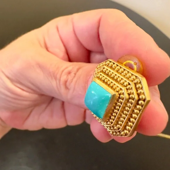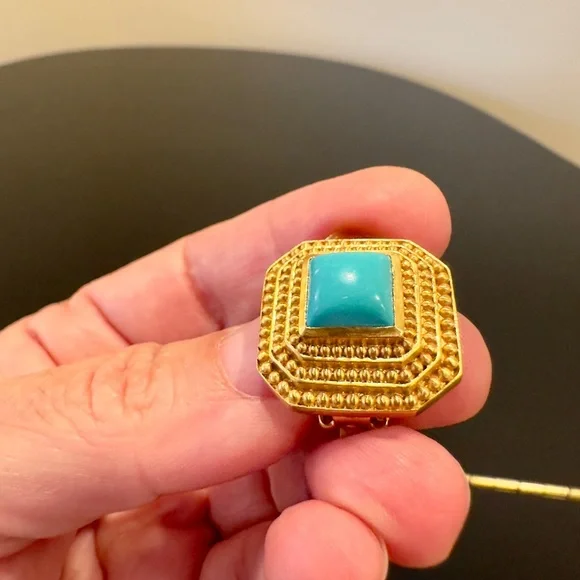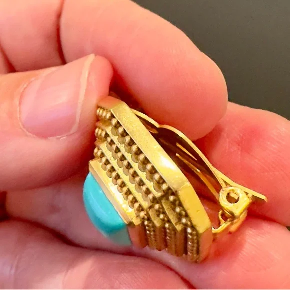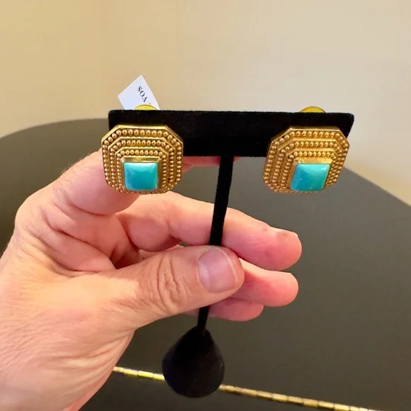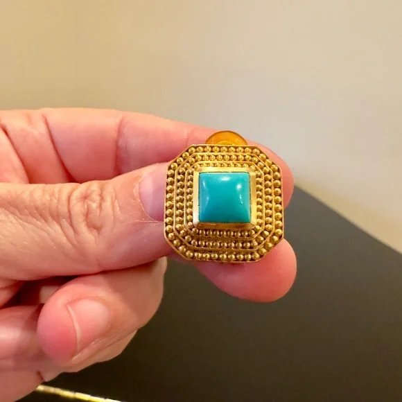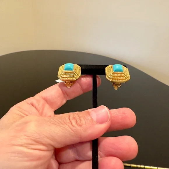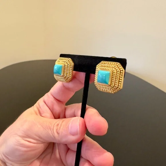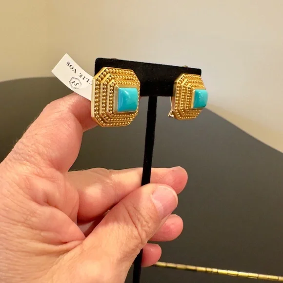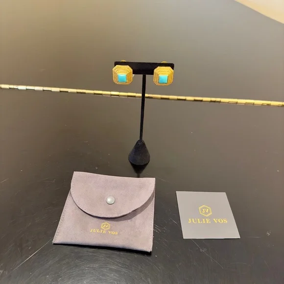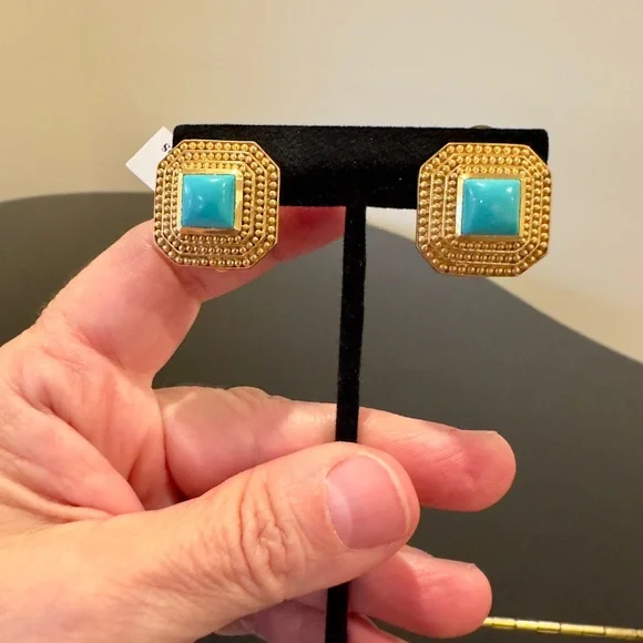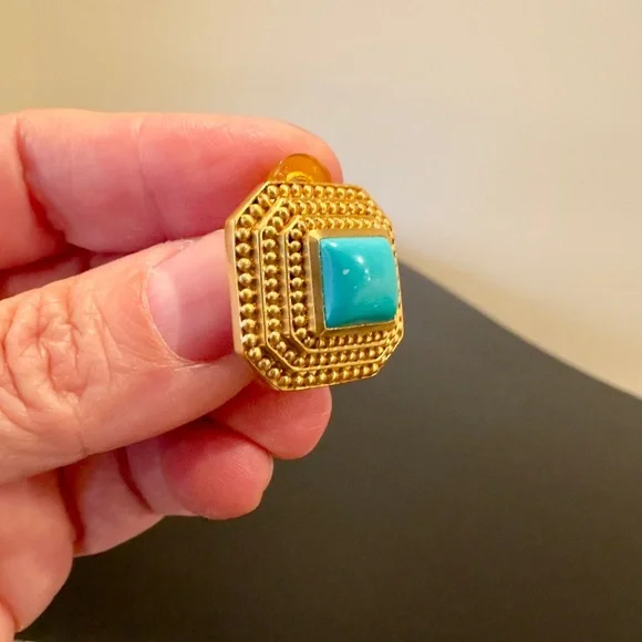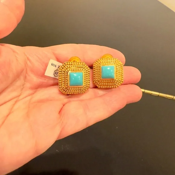 Authentic Luxury Spring Summer RARE Boho Julie Vos Clip Genuine Turquoise Earrings-beautiful coveted robins egg blue color genuine turquoise surrounded by step rows of bead detail that add dimension, look at video to see quality of earrings, very substantial-I called JV to confirm that all my turquoise pieces were genuine turquoise & not composite, they confirmed that genuine turquoise, we also discussed that JV currently has no turquoise pieces-Julie Vos (JV) hallmark on back, back beautifully finished-24K gold plated over nickel free brass & sealed to prevent tarnish, can tell from rich color 24K gold plate-JV pieces designed & HANDCRAFTED to standards of fine jewelry, each stone hand cut & unique & have own characteristics, same w/24k gold plated brass, metal work, plating, brand new, never worn, SOLD OUT-clip on style, round comfort pad in clip, has yellow tint to blend w/gold plating-between .75” - 1”, turquoise between .25” - .5”-stock pic turquoise have veining, my earrings don’t have veining, will list same earning w/veining-orig JV pouch & product info/care instructions included-will include more than one nice gift w/purchase-look at pics & video as will help describe item, pics of small parts of metal work on side where not smooth, not defects, because hand crafted & how purchased, pics of very small white parts on turquoise in one earring, natural characteristic of high quality unadulterated turquoise-SOLD OUT ONLINE,VERY RARE