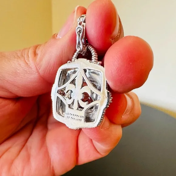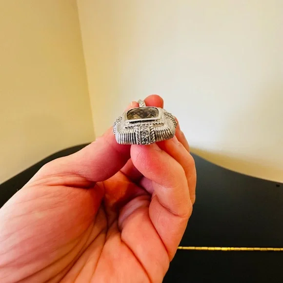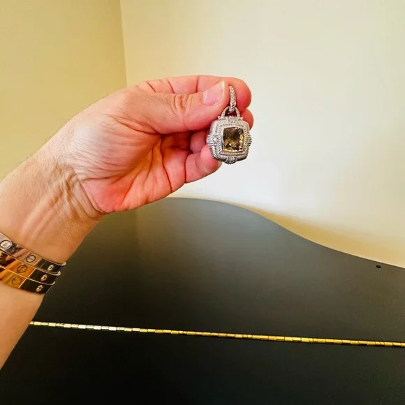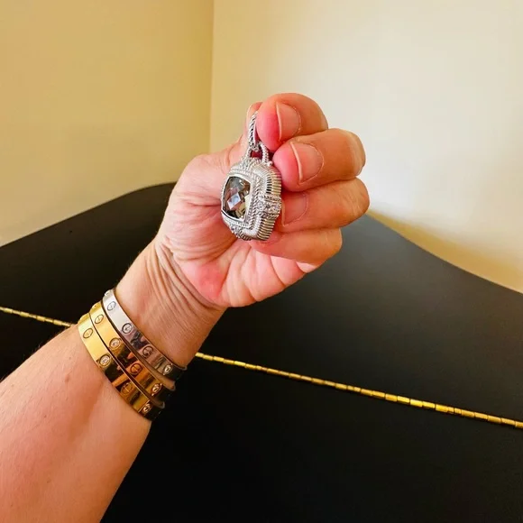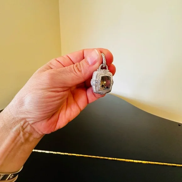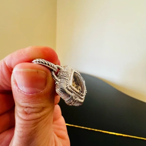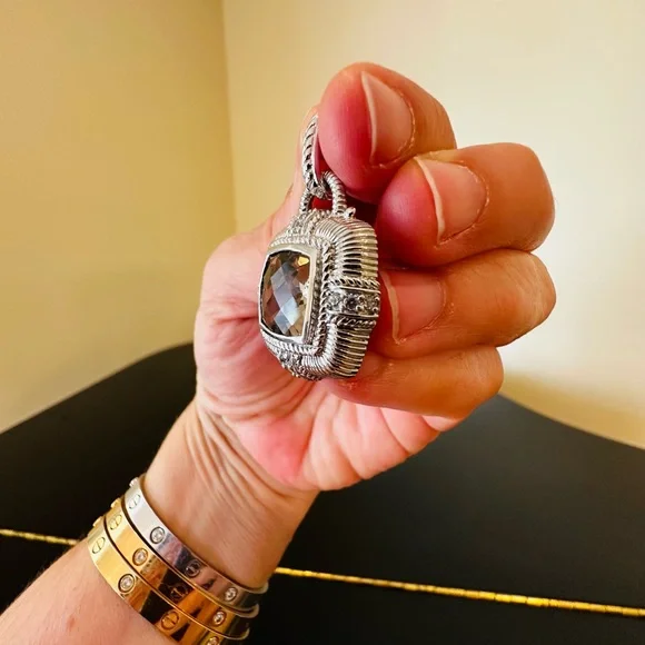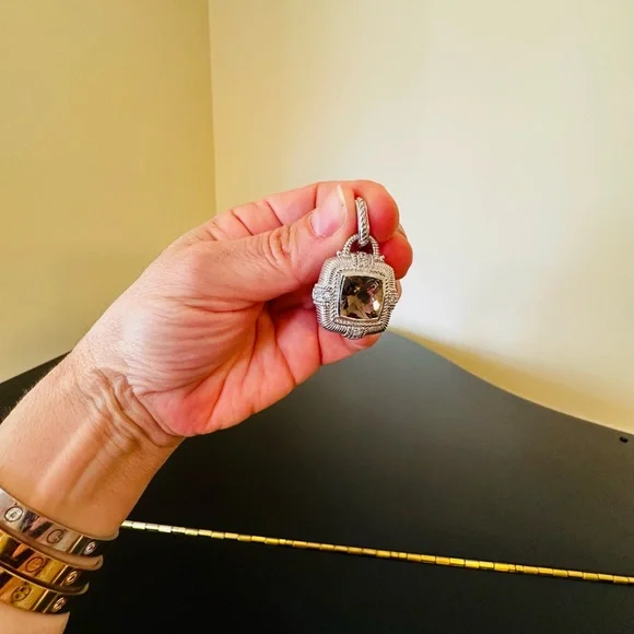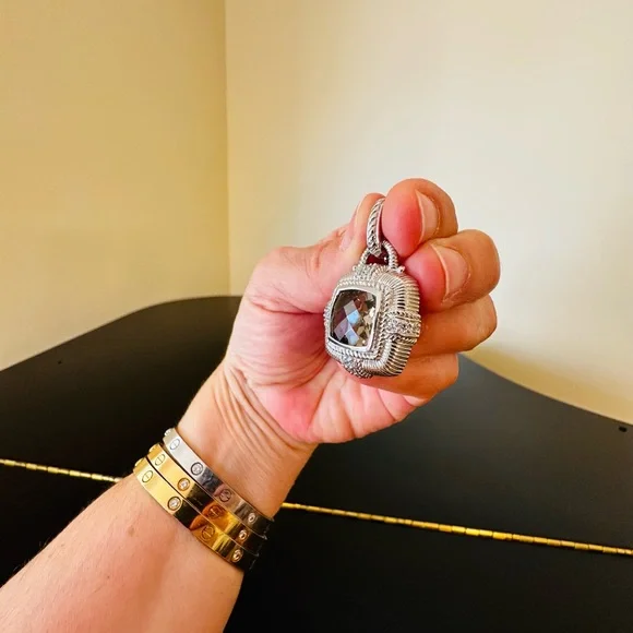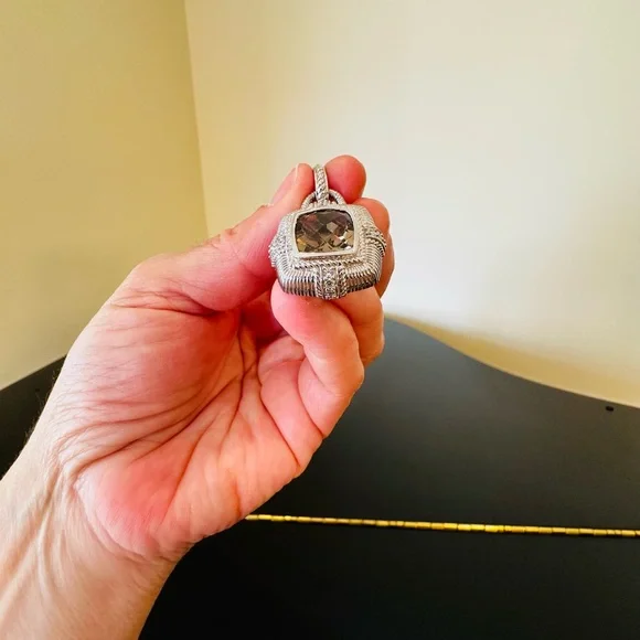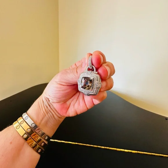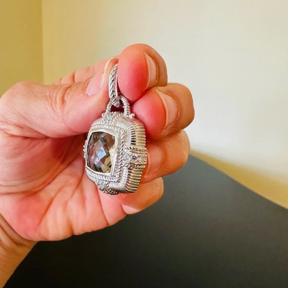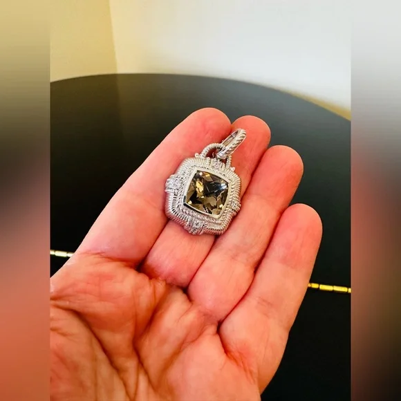 Judith Ripka Vintage Retro Estate Designer Luxury Couture RARE Authentic Formal Sterling Silver Smokey Quartz diamonique pendant/enhancer-stunning Judith Ripka pendant featuring beautiful substantial genuine checkerboard bezel set smokey quartz gemstone, good size sparkling diamonique stones, rope & textured detail, WOW-great addition to any jewelry collection, wear on chain, pearls, charm bracelet...-bail opens so you can put on larger necklaces like pearls, bracelets, safety catch-rhodium plated sterling silver, very well made-back finished nicely, JUDITH RIPKA 925 CZ THAILAND embossed, cut out design on back, nice weight-little over 1.5" L x about 1" W-excellent vintage condition, front looks like never worn, back has very minor surface scratches expected for vintage preloved piece-will include more than one nice gift w/purchase, check out my reviews-SOLD OUT ONLINE & IN STORES, RARE-look at pics & video as help describe item-other listings:Celine, Givenchy, David Yurman, Ferragamo, Majorica, , , Zara, J. Crew, Vineyard Vines, Theory,Kendra Scott, Anthropologie, Kate Spade, Michael Kors,Ralph Lauren,Zac Posen,Ray-Ban, Cartier, Tory Burch, Burberry, Alexander McQueen, Julie Vos,Ted Baker, Free People, Tiffany & Co., Louis Vuitton, Marc Jacobs, BCBGMAXAZRIA, St. John, ESCADA, Lululemon, , UGG, Juicy Couture, Maaji, Steve Madden, Tahari, Kenneth Jay Lane, Alice + Olivia, Alexis Bittar