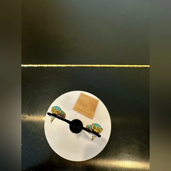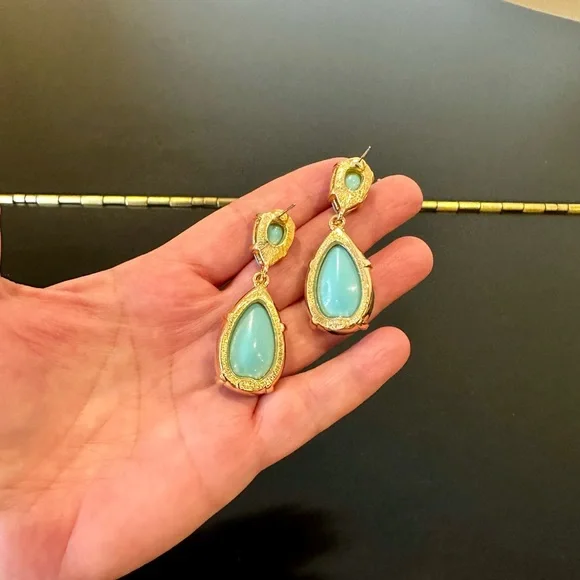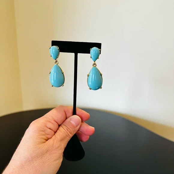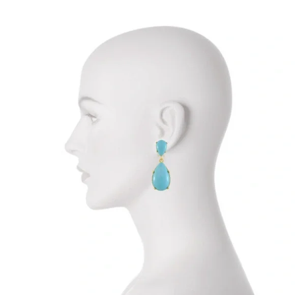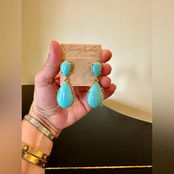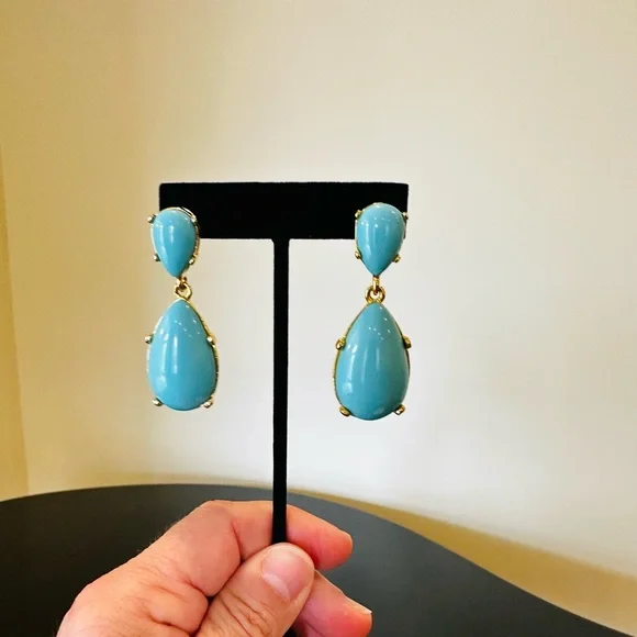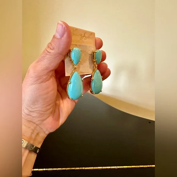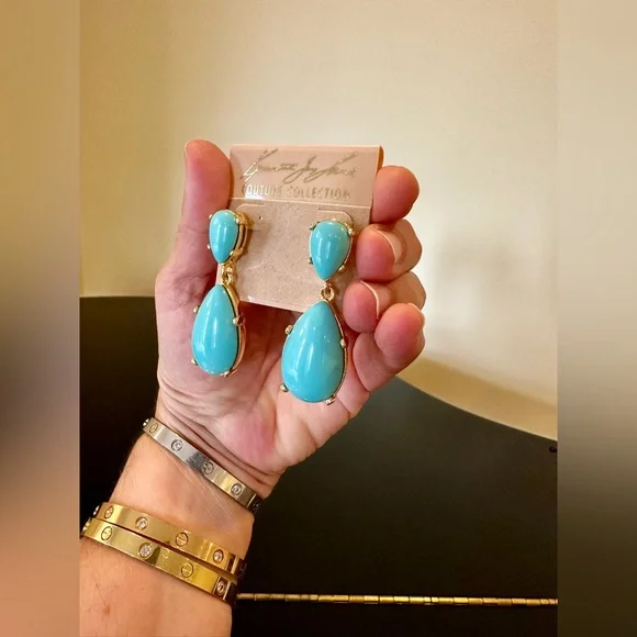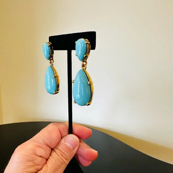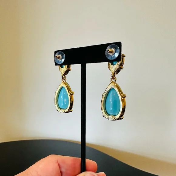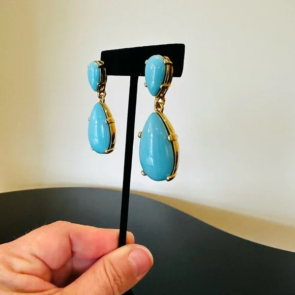 NWT Authentic Luxury Retro Minimalist Spring Kenneth Jay Lane Turquoise Cabochon Drop Earrings-From KJL’s fabulous Couture Collection, fall in love w/these stunning pear shaped turquoise cabochon drop earrings!These oversized drop earrings combine exquisite color w/maximum glam,when you want a drop-dead gorgeous look, gorgeous addition to any jewelry collection, perfect w/your spring & summer outfits-22-karat yellow gold electroplating on brass casting-made for pierced ears,clutch earring backs-about 2.25” H, between .75” - 1” W at widest part-back of earrings finished beautifully, can see back of gorgeous turquoise stones, sig KENNETH©LANE hallmark on back-beautiful color very similar Persian turquoise robin’s egg blue,I own a lot of Persian turquoise & color of earrings is very similar-is a smaller clip version of these earrings,mine is larger retired version for pierced ears that’s completely sold out, I also don’t see the Couture Collection available anymore,very rare, beautiful substantial earrings-For nearly 60 years,KJL (April 22, 1932 – July 20, 2017) was one of most famous costume jewelry designers in world.Lane was named, “undisputed King of Costume Jewelry” by Time Magazine.Lane was friends w/,beloved by, worn by celebrities, royals, first ladies, socialites such as Jackie Kennedy, Babe Paley, Elizabeth Taylor, Duchess of Windsor, Barbara Bush,Nancy Regan….-gift w/purchase-SOLD OUT ONLINE & IN STORES
