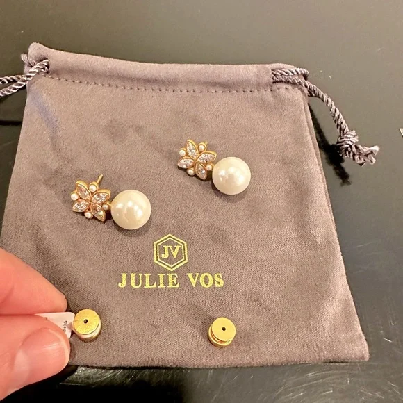 Julie Vos Authentic Luxury Minimalist Wedding Party Bride RARE Pearl CZ Drop Earrings-Need a wardrobe refresh,add some major glamour into your jewelry collection w/these STUNNING JV pearl & CZ drop earrings-Luminous substantial 12 mm shell pearls (about .5" W) suspended from shimmering cluster of marquise-cut CZ & delicate freshwater pearls-about 1" L-for pierced ears,sig JV earring backs w/JV hallmark & small CZ, JV hallmark embossed on back of earrings-24K gold plated over nickel free brass & sealed to prevent tarnish,can tell from rich color that24K gold plate-Julie Vos pieces designed & HANDCRAFTED to standards of fine jewelry,each pearl is unique & have own natural characteristics, any unique characteristics of CZs, metal work, plating, because handcrafted, any differences in pearls or nacre is because not man made, natural characteristics, very tiny parts of metal work on back of one earring, top of one earring & earring backs not as smooth as rest, because meticulously handcrafted-orig JV pouch & product info/care instructions included-SOLD OUT ONLINE, RARE-look at pics as help describe item-will include more than one nice gift w/purchase, look at my reviews-other listings:David Yurman, Ferragamo, Majorica, , , Zara, J. Crew, Vineyard Vines, Theory,Kendra Scott, Anthropologie, Kate Spade,Michael Kors,Zac Posen,Ray-Ban, Cartier, Tory Burch, Burberry, Alexander McQueen, Ted Baker, Free People,Tiffany & Co.,Louis Vuitton, St. John, ESCADA, Lululemon