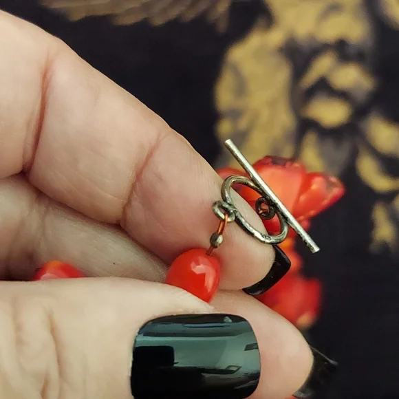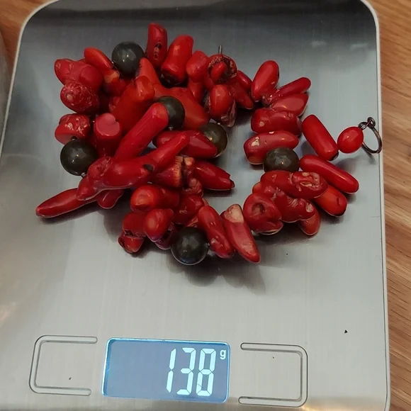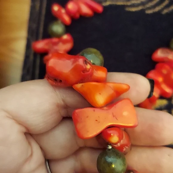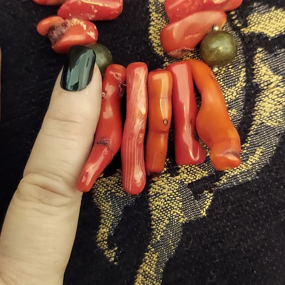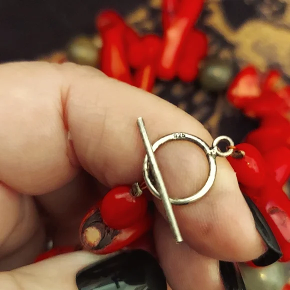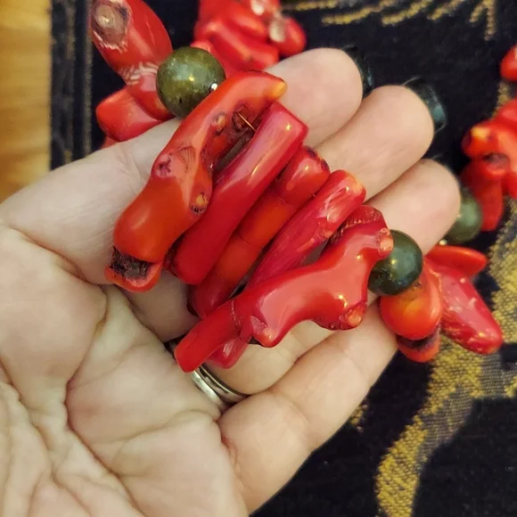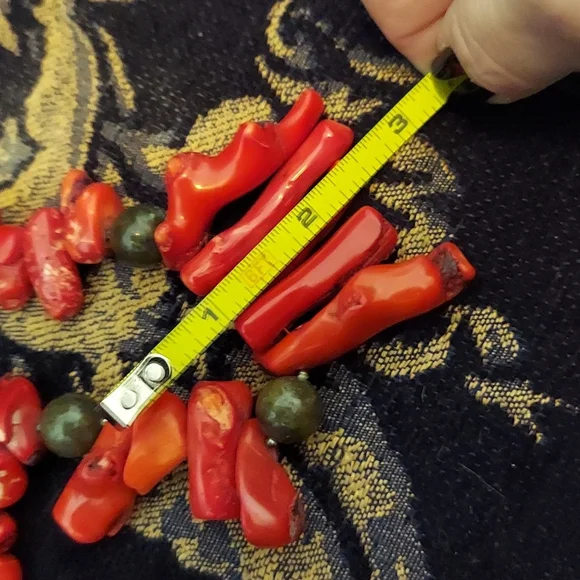 HUGERAW Coral pieces strung on wire sterling silver with sterling mini beads divide the large pieces, measures 18.5" long, Coral pieces vary up to 2.75" length AMAZING PIECE stamped sterling silver.