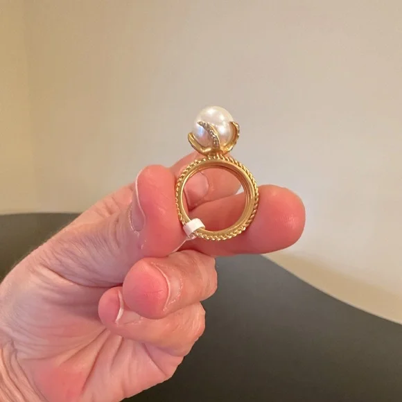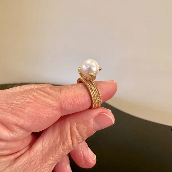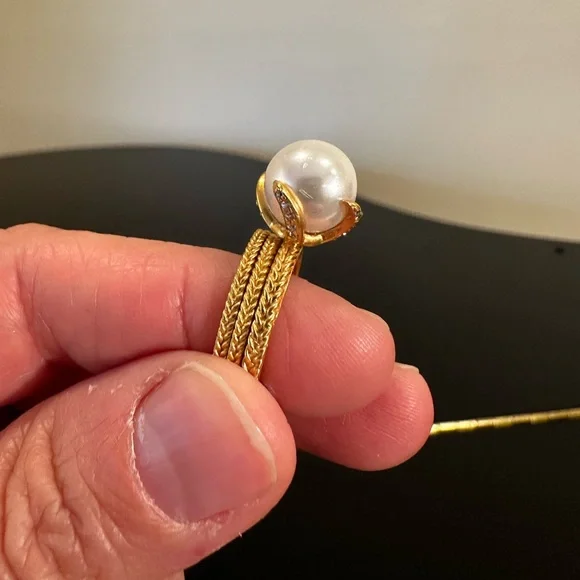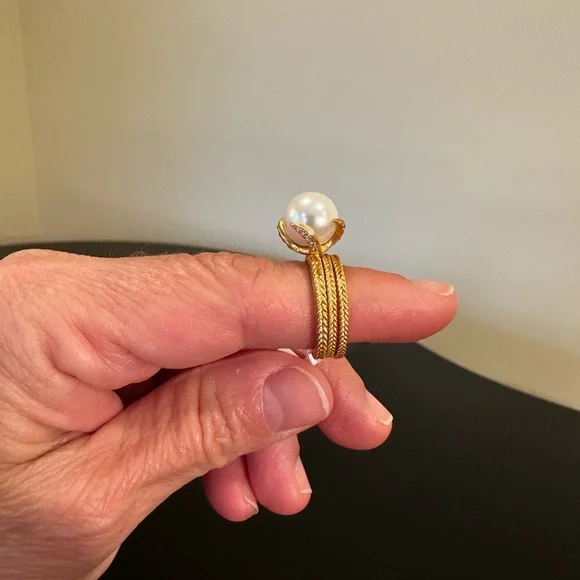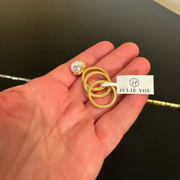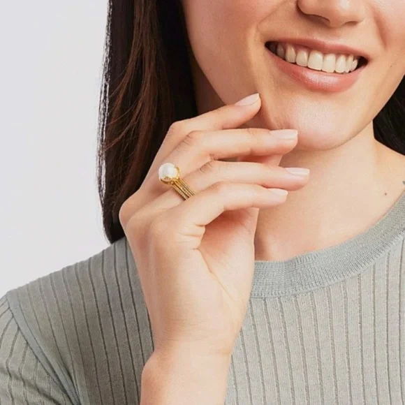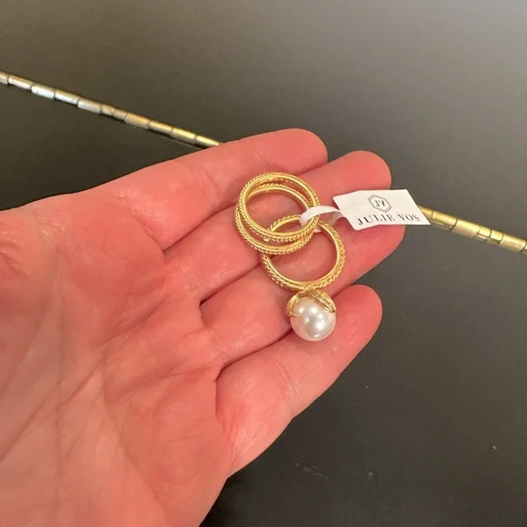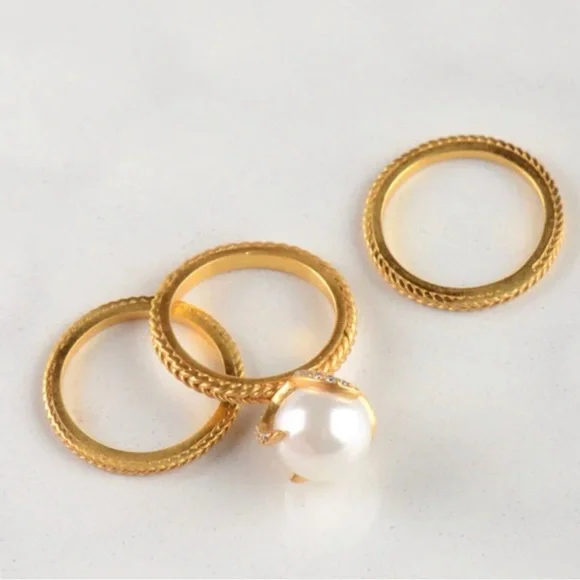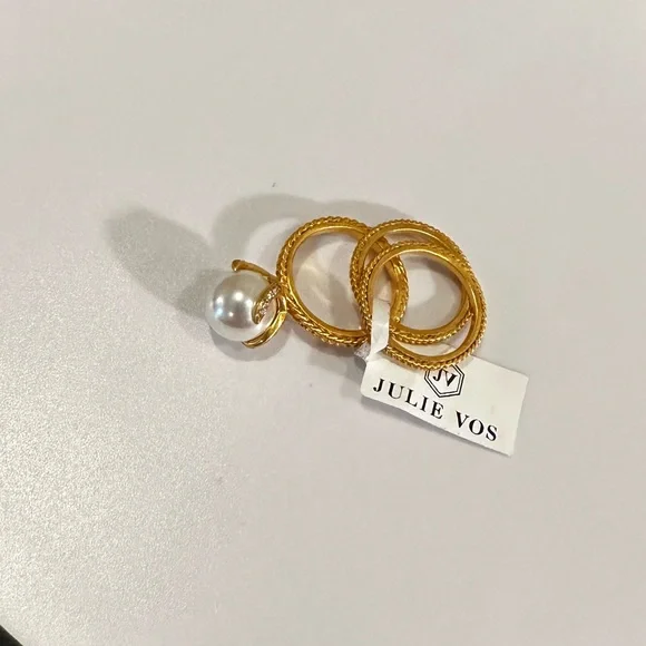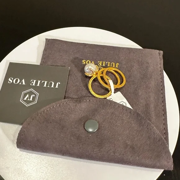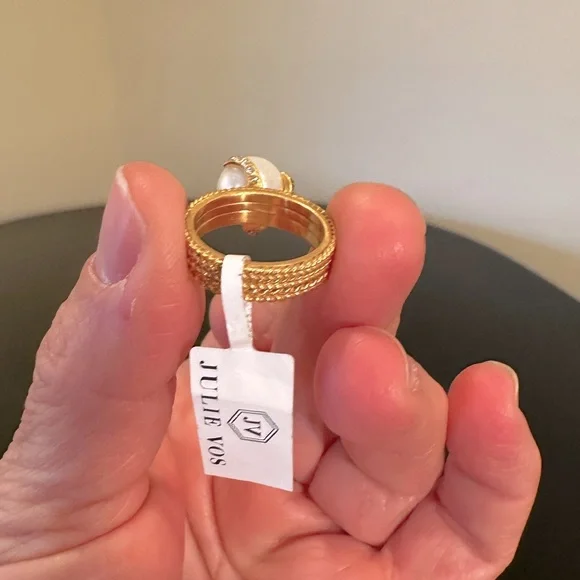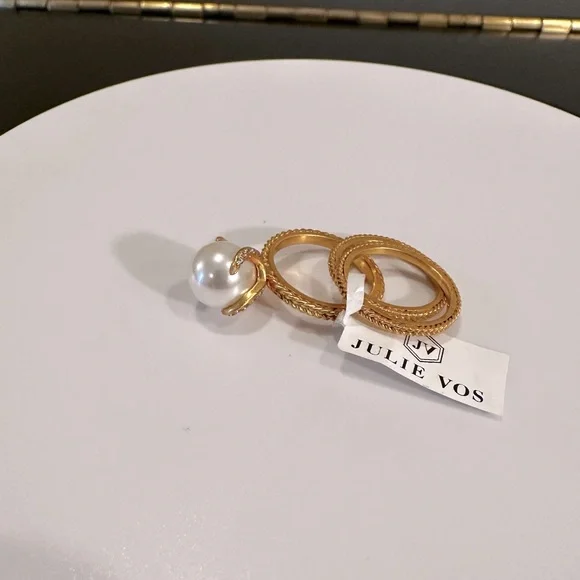 Julie Vos Authentic Rare Luxury Minimalist Timeless Classic Shell Pearl Cubic Zirconia Ring Set-ring set that stacks & makes a statement,set of 3 rings you can stack together,wear separately,or share.This elegant & timeless ring set features 2 gold bands w/chevron detailing & ring w/substantial luxurious luminous pearl w/shimmering CZ-encrusted golden petals on chevron-detailed 18K gold plated brass band-perfect way to add some sparkle to your life, Julie Vos jewelry is designed to be daily dose of luxury.Each piece is handcrafted,set in 24k gold plated brass, sealed to prevent tarnish-Shell pearl,cubic zirconia,24K gold plated over nickel free brass,can tell from rich color 24K gold plated-JV pieces designed & HANDCRAFTED to standards of fine jewelry, each CZ is hand-cut & unique, each pearl is unique w/own natural characteristics, every stone hand set, any unique characteristics of stones, pearl, metal work, plating is because handcrafted, genuine shell pearl w/great luster & nacre w/natural pearl characteristics, how nature made it, tried to capture in last pic-size 6-pearl & setting little over .5” W-original Julie Vos pouch & product info/care instructions included-other listings:David Yurman, Ferragamo, Majorica, , , Zara, Kendra Scott, Anthropologie, Kate Spade, Michael Kors,Ralph Lauren,Zac Posen,Ray-Ban, Cartier, Tory Burch, Burberry, Alexander McQueen, Ted Baker, Free People, Tiffany & Co., Louis Vuitton, Marc Jacobs, St. John, ESCADA, Lululemon