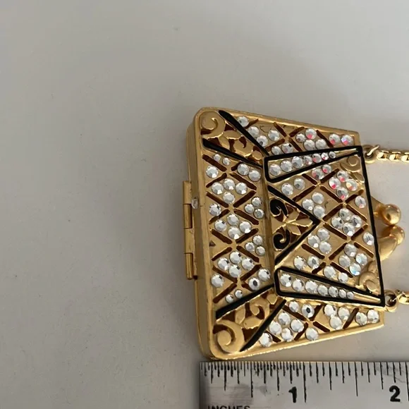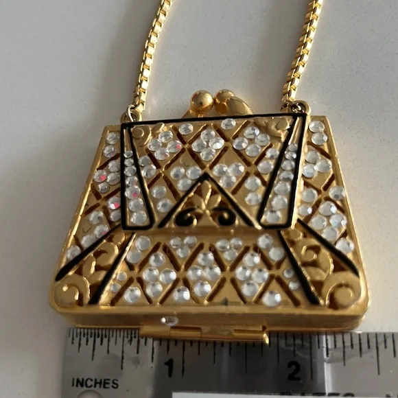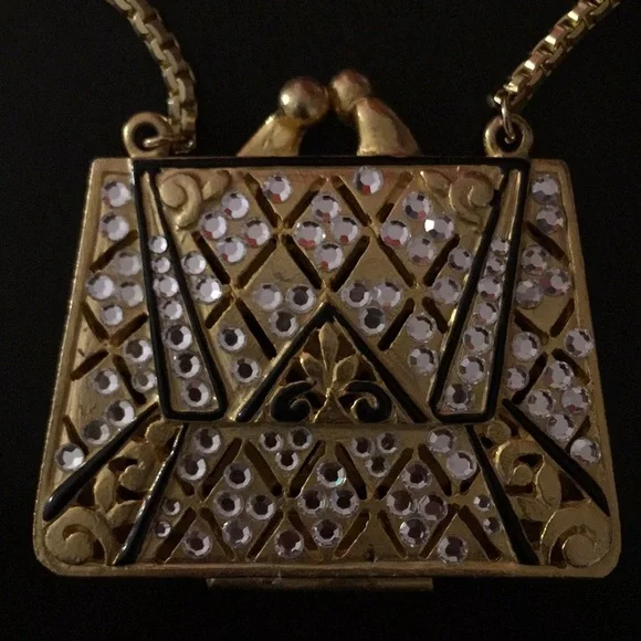 CRAFT Intricate gold-toned deco detailing with a kiss latch at top. Nice black enamel and crystals in the design. Can be worn as a necklace or as a crossbody purse. Can hold a few...