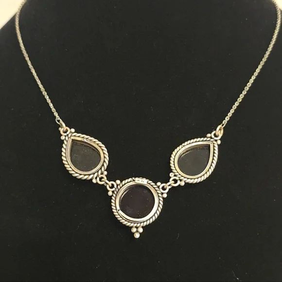 925 Sterling silver black onyx three stone necklace. The artist´s hallmark (BA) is unknown. "Sterling" is stamped on the backside of this pieceNecklace and pendants...