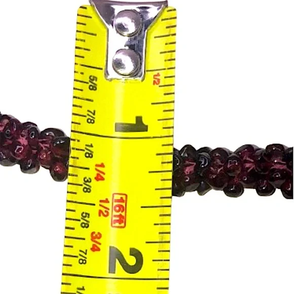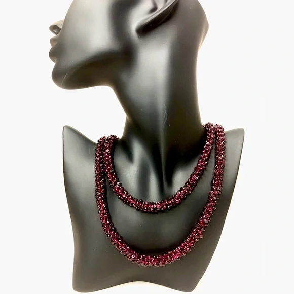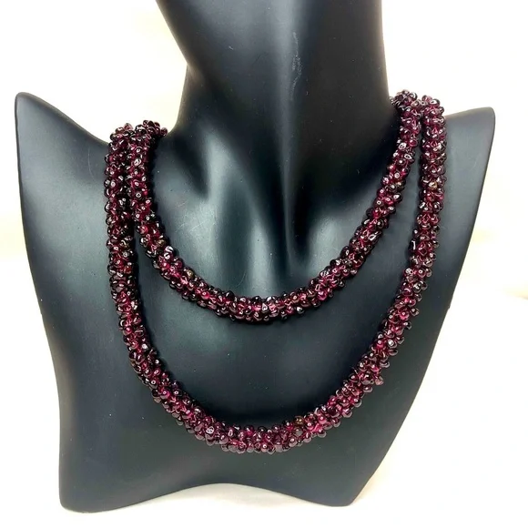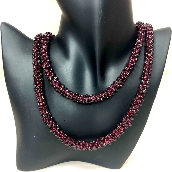 Red Rhodolite Garnet Gemstone Cluster Necklace 32 inches Long Brand New But Vintage (Stored Necklace)Red Garnet Pyrope Gem Stone NecklaceBrand New ItemNecklace Has Been Stored and Never Before Been UsedVintage Pyrope Red Garnet Grape Cluster NecklaceMade in IndiaNecklace Measures Approximately 32 inches in length and 3/8 inches wide Color May Vary Based On Shadows, Lighting, Monitor, Display Settings Ask Questions and/or Request Additional Photos, Measurements as NeededPhotos of The Measurements Are Available In The Slides