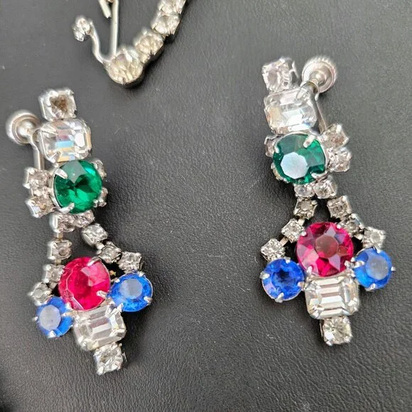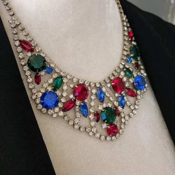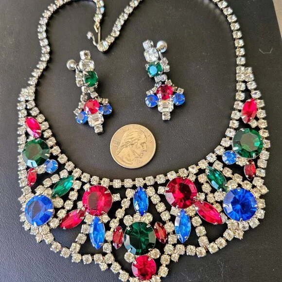 Stunning Vintage Rhinestone Bib Necklace & Earring Set Jewel TonesThis gorgeous necklace will get you noticed with its stunning jewel tone rhinestones outlined with clear rhinestones throughout and including all of the chaining. Ruby red, sapphire blue and emerald green make for a festive color scheme and the bib style stands out on the neckline. Includes wearable screw back earrings in the same jewel tones - not a matched set in shape, but a perfect married set in color. All stones are prong set into shiny silver tone metal.The necklace measures approximately 18 inches long and is adjustable shorter with the hook style clasp. It measures 2 inches wide at the widest part in the front. It is substantial and well made. Necklace is unsigned, but I did find a very similar necklace at the Isisjulianajewelry.com website at reference No. 7818. The entire front portion of the bib is constructed exactly the same with the double loop rhinestone chaining, headlight chatons, and navettes in the same places, and the difference at either side in the way the chaining meets up.The dangle drop style earrings have screw backs and are a beautiful match with their own ruby red, sapphire blue, emerald green and clear rhinestones. As noted previously, this is a married set.This set is in excellent vintage condition.