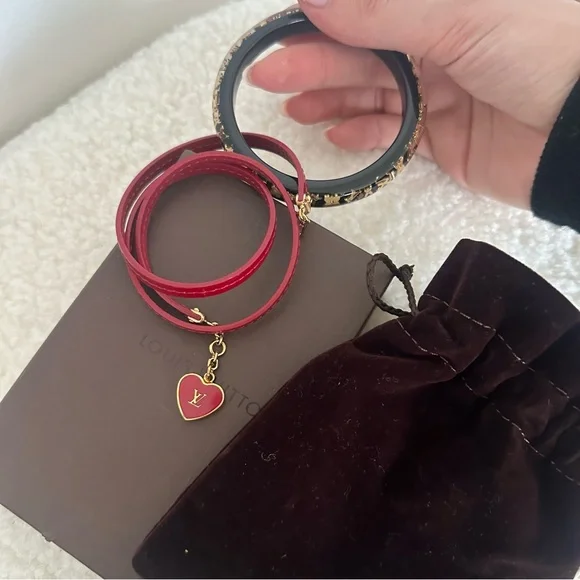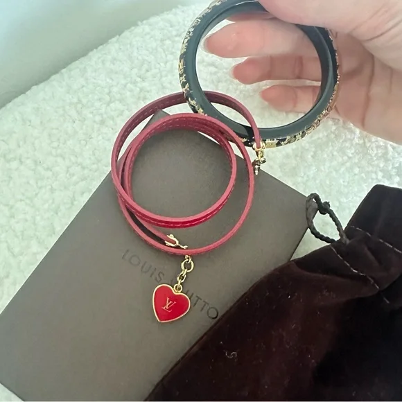 This stunning LV red bracelet features a charming gold heart pendant, perfect for adding a touch of elegance to any outfit. Packaging is available upon request
