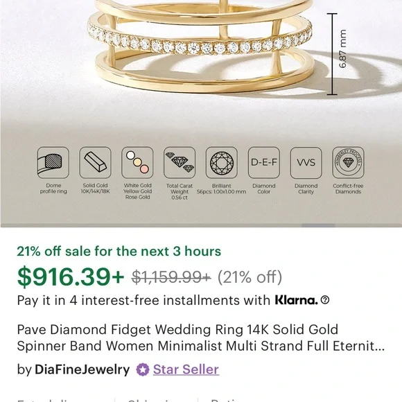 the ring was worth it, too bad the manchild was not!my loss is your gain one of a kind and custom made movable ring. its really a special design. size 6.5-6.75. avoid water and heavy lifting etc, so you dont want the ring to be a tight squeeze. Don´t buy if you´re a size 7 unless you have a plan to resize it somehow...See pics: The full eternity band is missing only ONE stone. Great condition for a pre worn delicate band! Comes with the original green velvet box from the brand!