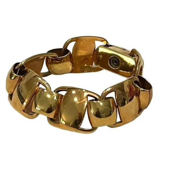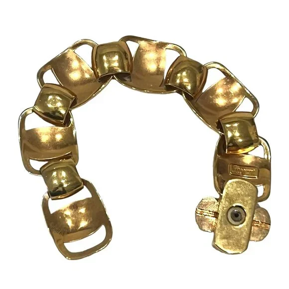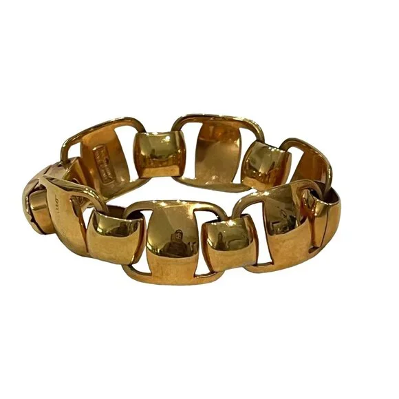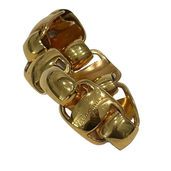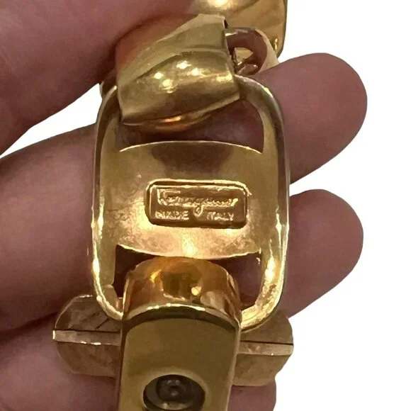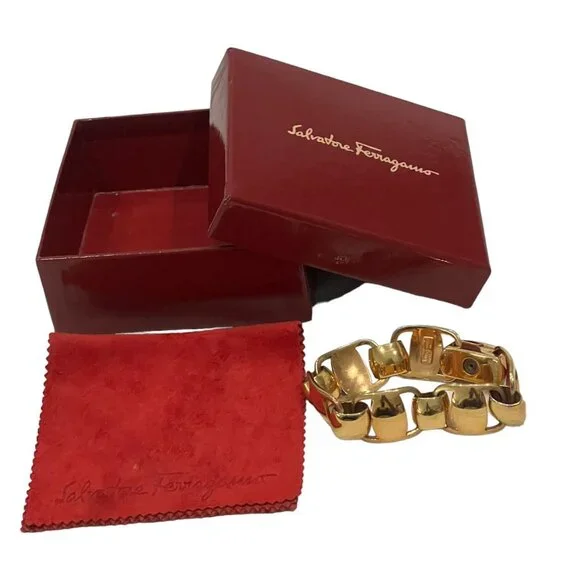 Gold, metal "Gancini" link bracelet accented by swivel clasp closure with "Ferragamo" logo at sideColor: GoldMaterial: MetalFastening: Swivel claspMade/Handcrafted in: ItalyBox/Dust Bag: Ferragamo Box & Duster Photo #2Sizing & Measurements (approx.):Full length (end to end): 8"Size: fits up to 7 3/4"Width: 3/4"Condition: pre-owned (zoom photos)several tiny very faint micro-rubs/scratches visible with direct light & magnificationNotes*: Authenticity 100% Guaranteed Camera lighting and reflections may pickup some tiny white/dark lint and/or create some color variation/shadows/glare spots/marks that are not actual defects (please ask if unsure). Color may appear differently on varying monitors and device settings Estimated Retail - current comparable style estimated new MSRP price