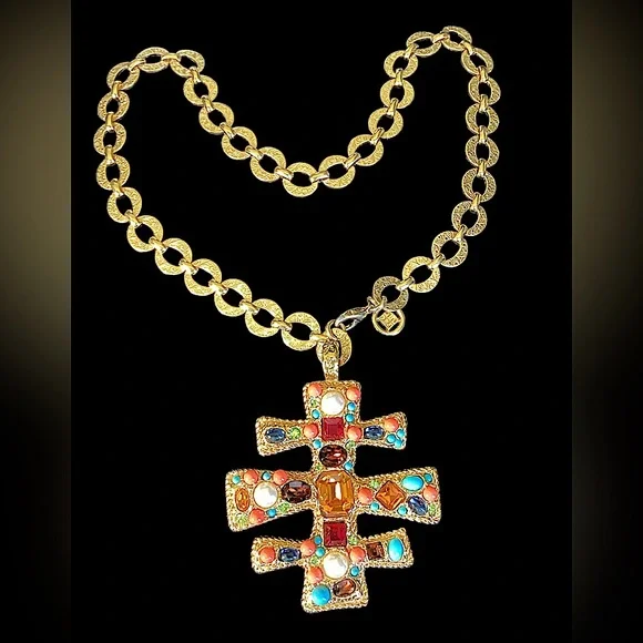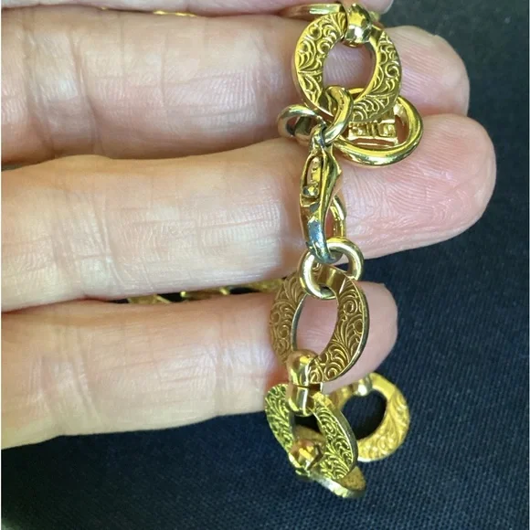Sale is for gold chain only. The jeweled enhancer is sold separately.Vintage from the 1980’s.Gold links are delicately etched. Signature cartouche hangs from clasp.in overall fantastic condition, only the lobster claw closure has a tiny bit of wear. See last photo. Buyer accepts disclosed condition.