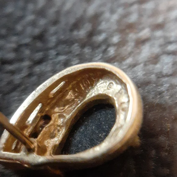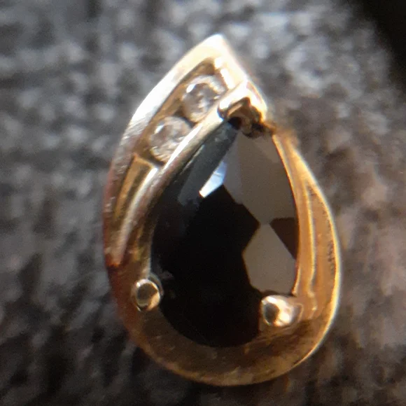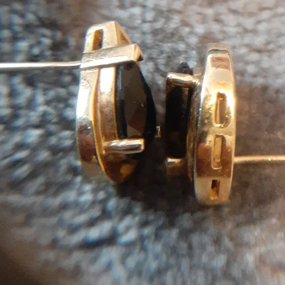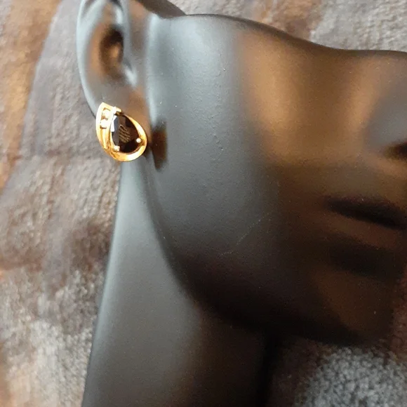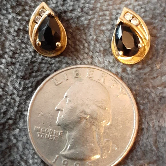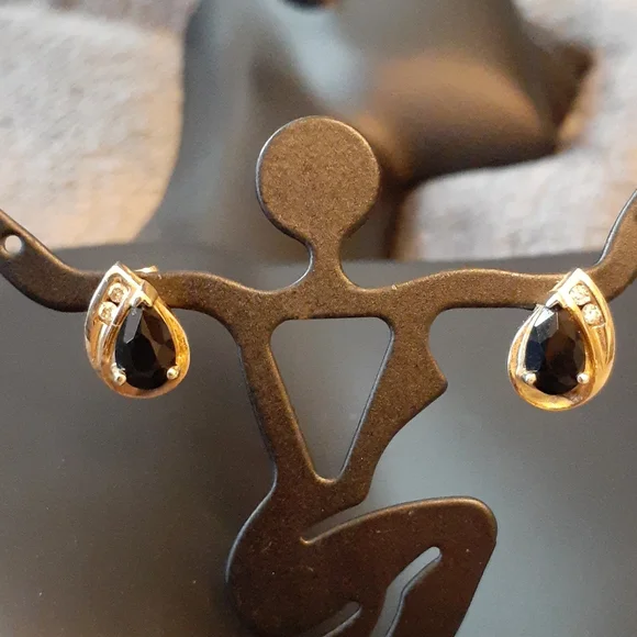 10k solid yellow gold earrings. each earring has 2 tiny round diamonds and 1 pear shape black stone which I believe is onyx but not 100% earring backs are not tested.