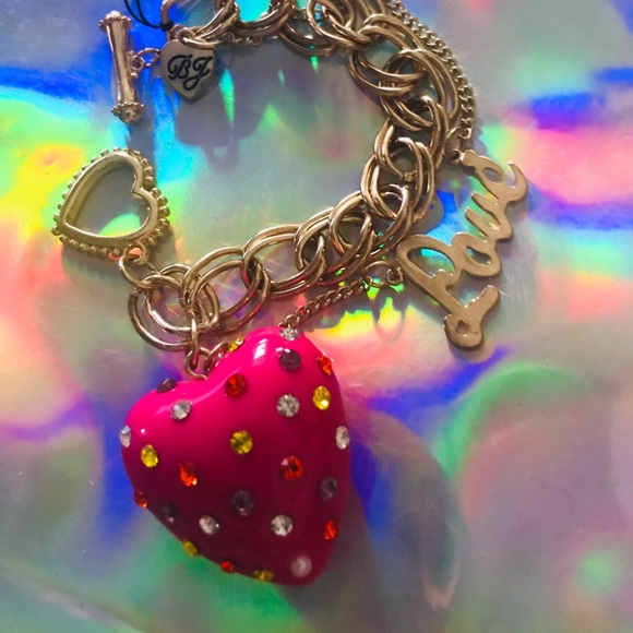 Vintage bracelet with large lucite crystal rhinestone embedded heart gold chain that says love by Betsey Johnson