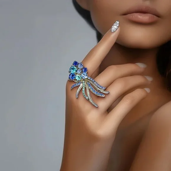 Oscar de la Renta Blue Comet Ring with Pavé Trails in Silvertone & Austrian Crystal Make a bold statement with the Oscar de la Renta Blue Comet Ring, a celestial-inspired masterpiece designed to dazzle. Featuring a striking combination of Austrian crystals in sapphire and blue zircon hues, this ring is set in a luminous silvertone finish. The elongated, pavé-adorned trails extend gracefully, covering two fingers for a dramatic yet elegant effect.Why Oscar de la Renta?Artistic Brilliance: Inspired by the cosmic beauty of a shooting star, this ring captivates with a radiant design.Exquisite Craftsmanship: Hand-set Austrian crystals in shades of sapphire and blue zircon ensure a luxurious sparkle.Perfect Fit: Designed for sizes 5-6, offering a comfortable yet secure fit.Statement Dimensions: The top measures 1" x 2" wide and stands 1.25" tall, creating an eye-catching presence.Lightweight Elegance: Weighing 17 grams, it delivers impactful style without compromising comfort.Embrace celestial glamour with this breathtaking Oscar de la Renta creation—where luxury meets artistry!SKU: OD0191-RG