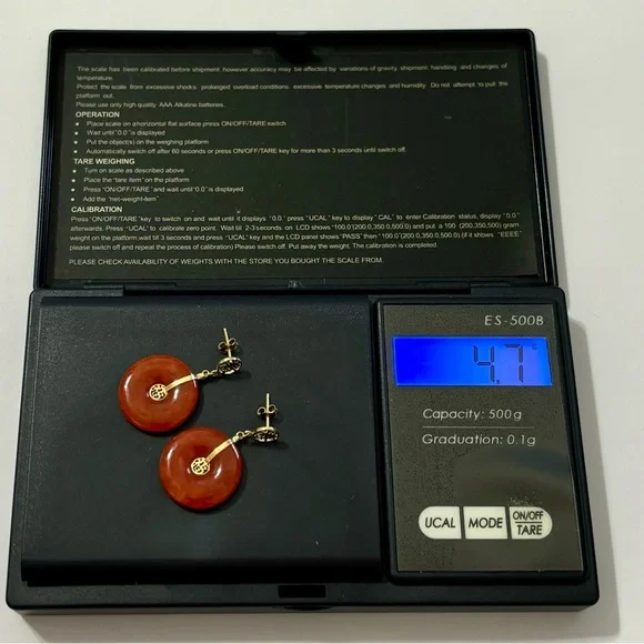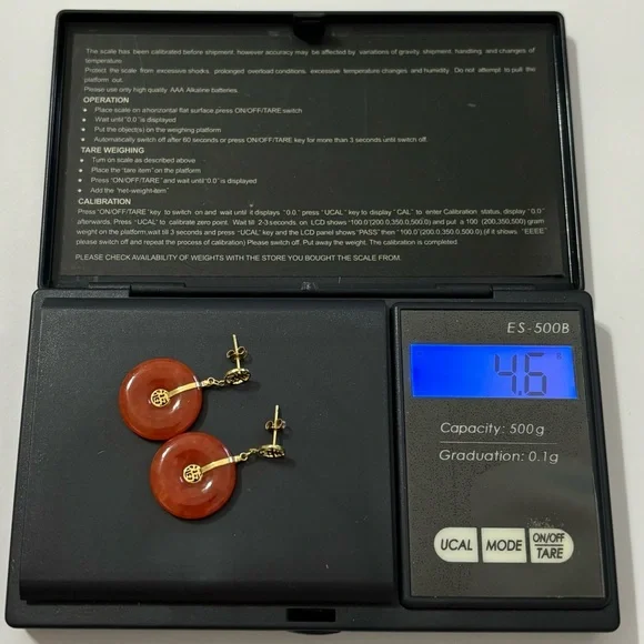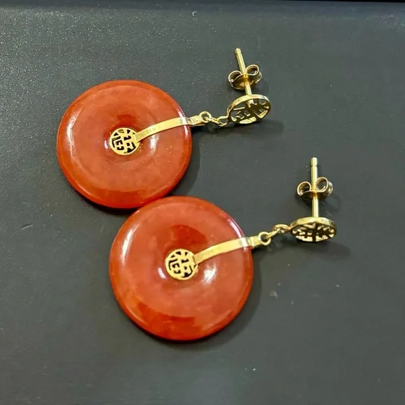 SOLID 14K GOLD ROUND CORAL DYED JADE DANGLE DROP EARRINGS - IN EXCELLENT CONDITION. COMES WITH ORIGINAL BACKS. APPROPRIATELY STAMPED AND GUARANTEED AUTHENTIC.