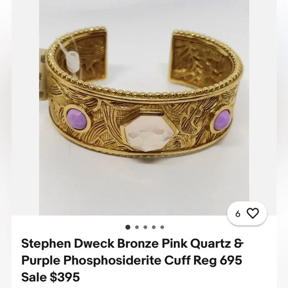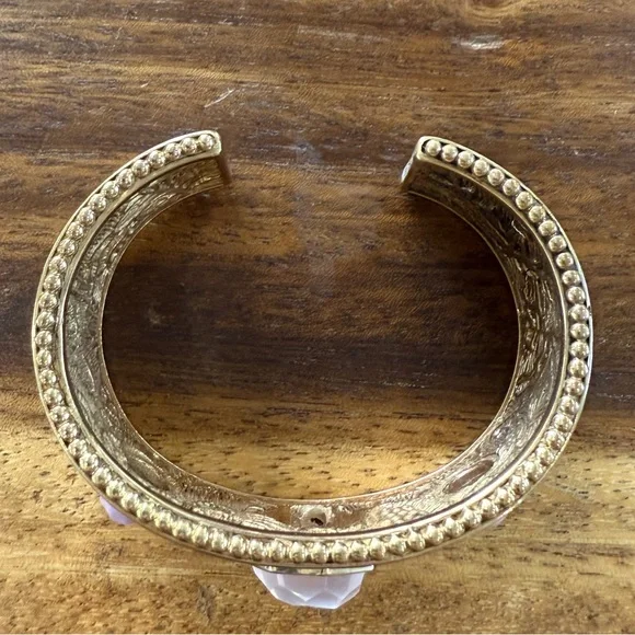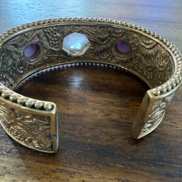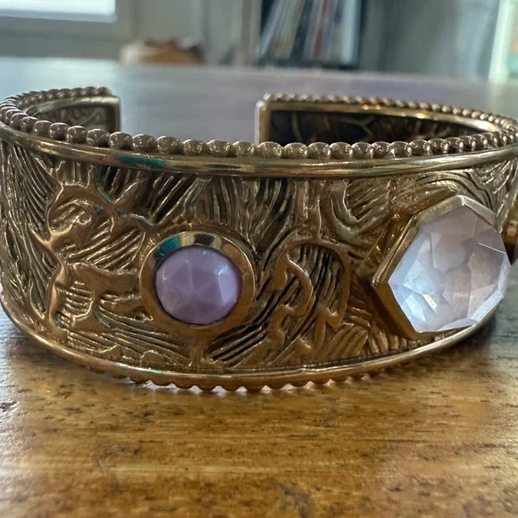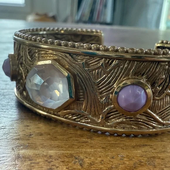 This beautiful handcrafted bronze cuff by Stephen Dweck features a richly textured design, accentuated by a trio of gemstones at its center. The focal point is a striking faceted rose quartz, flanked on both sides by two lovely purple phosphosiderite stones.