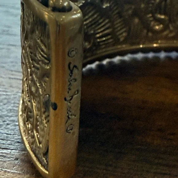 This beautiful handcrafted bronze cuff by Stephen Dweck features a richly textured design, accentuated by a trio of gemstones at its center. The focal point is a striking faceted...