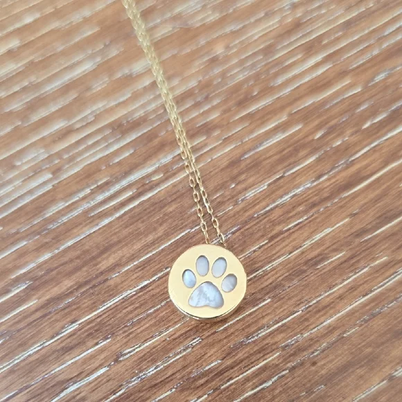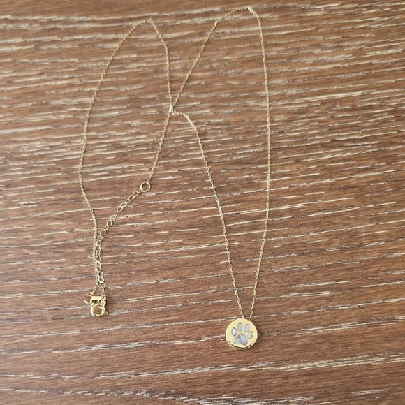 Elegant gold necklace with a paw print pendant. Perfect for animal lovers.