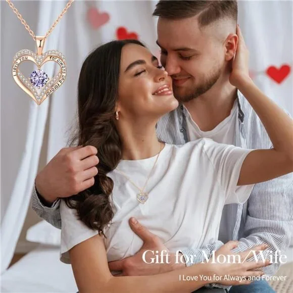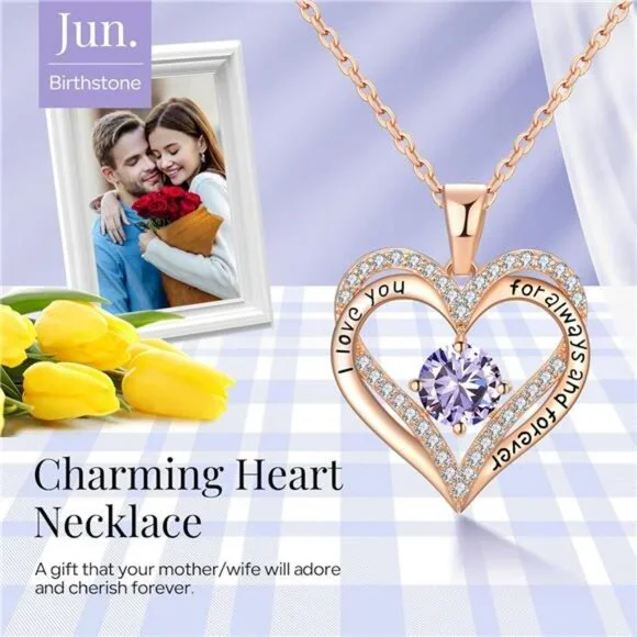 *Heart Shape Design: The necklace is engraved with "´I love you for always and forever´", which expresses your love and will surely warm her heart. You can show your love to your wife, girlfriend, mother, daughter and other women. This double heart necklace is a meaningful gift for her*18K Rose Gold Plated Necklace for Women: The heart necklace is made to resist oxidation and tarnish, which will keep its color for years. This is a very basic rose gold necklace that can be worn for a long time and won´t be out of fashion. Pendant size: 0.98"ⅹ0.86". Zirconia Size: 0.2‘’ⅹ0.2‘’ Necklace length: 15.7"+3"*The 5A Grade Cubic Zirconia - Jewelry Gifts for Women: In the center of the pendant, it is inlaid with a gem-quality 5A cubic zirconia. 5A cubic zirconia is the highest grade in zirconia, which is quite sparkly in the light*12 Colors of Birthstones for 12 Months: There are 12 colors of birthstones representing 12 months.The rose gold birthstone necklace makes a elegant birthday Jewelry for women. Garnet for Jan, Amethyst for Feb, Aquamarine for March, Diamond for Apr, Emerald for May, Alexandrite for June, Ruby for July, Peridot for Aug, Sapphire for Sept, Tourmaline for Oct, Citrine for Nov, Turquoise for Dec