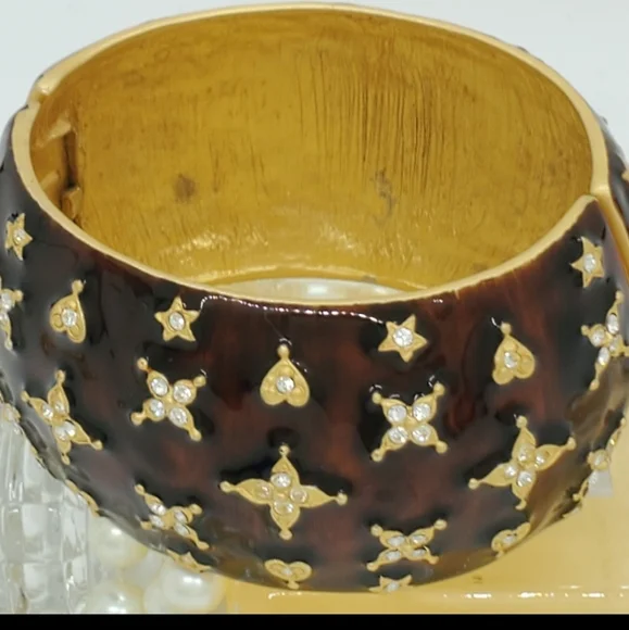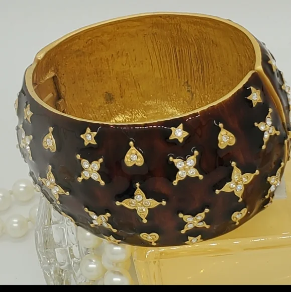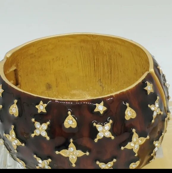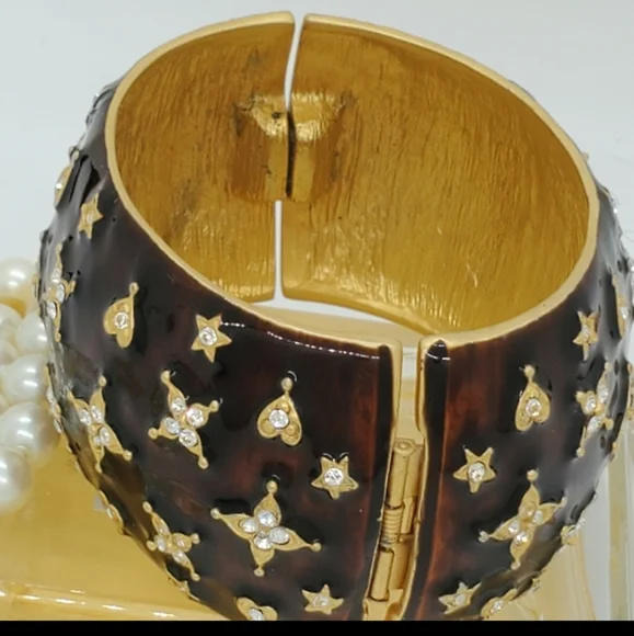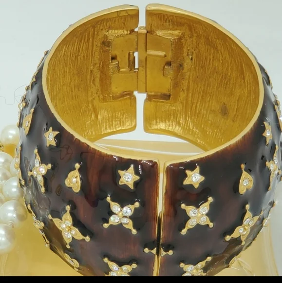 For your presentation is this incredible authentic vintage Kenneth Jay Lane signed KJL China Austrian crystal gold plated very rare large statement hinge cuff bracelet. This rarity is highly collectible and is in good vintage condition. There are no missing stones. The dust bag is not included. The metal content is unmarked.Measurements are approximately 2 3/4 accross and 1 3/4 inches wide.