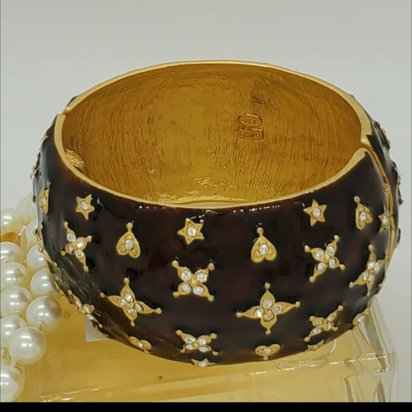 For your presentation is this incredible authentic vintage Kenneth Jay Lane signed KJL China Austrian crystal gold plated very rare large statement hinge cuff bracelet. This...