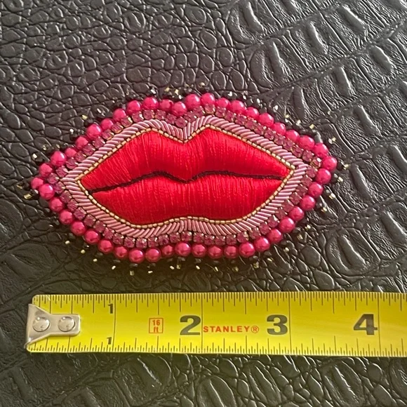 CELESTE MOGADOR -Designer pin Red Mouth Pin with Beautiful StonesHAND EMBROIDERED JEWELRY Red silk threads & Black BeadsBeautiful Stones & Beads Back of the brooch:is gold plated pin and clasp. Brand New With Tag
