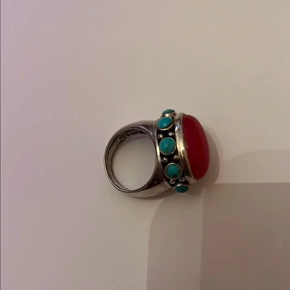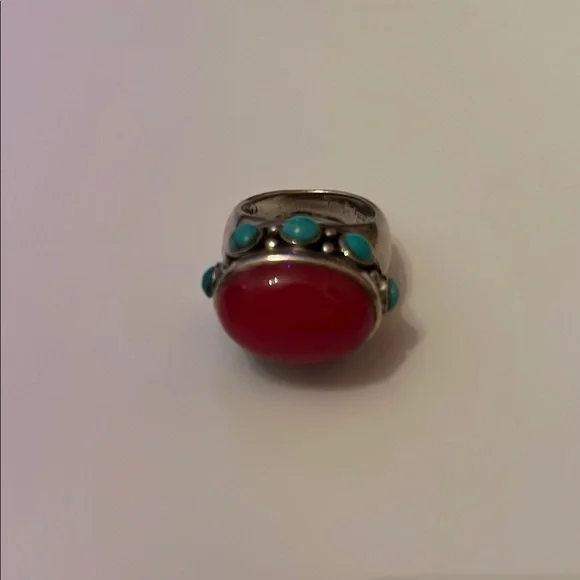 This exquisite ring showcases a vibrant red stone, beautifully accented by striking blue details. A perfect accessory to elevate any ensemble.