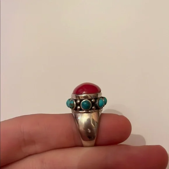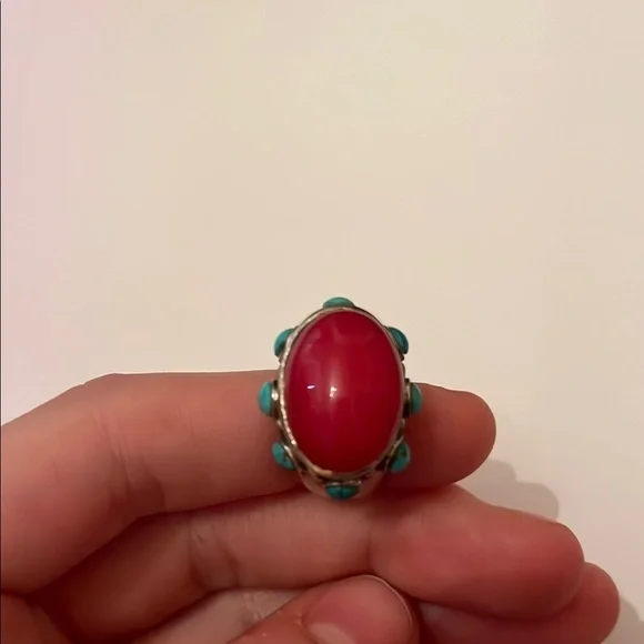Vintage Pink Rubellite Tourmaline and Turquoise Sterling Silver Ring