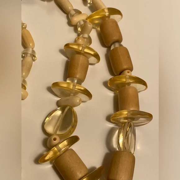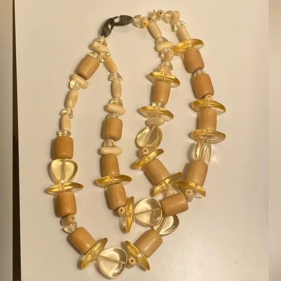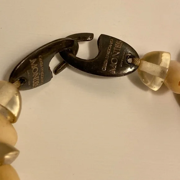 All Monies jewelry pieces are one of a kind! This vintage statement necklace is gorgeous, made from natural material. (See Monies blurb below)Double stranded choker style with wood and lucite hand carved, hand strung beads. Both clasps are stamped for authenticity - Gerda Lynggaard Monies Copenhagen Monies produces one of a kind rare designer pieces. You literally won’t find another like this!From the Monies website: Timeless designs in exclusive materials. Each piece of jewellery is unique and defined by the naturalness of the material. Some pieces come easily; others remain unfinished for months while waiting for that one specific stone to make everything complete.