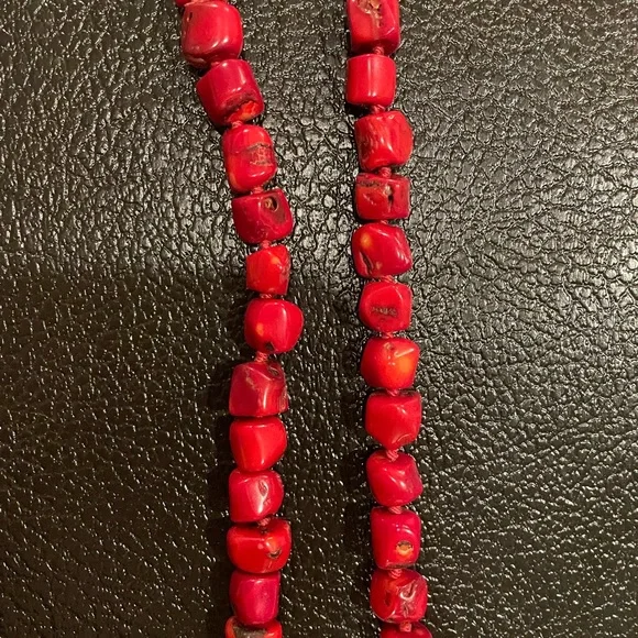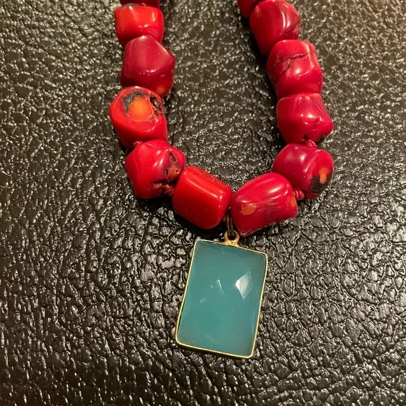 Hand knotted in silk cored red coral and blue chalcedony with 18k gold platted sterling silver bezel