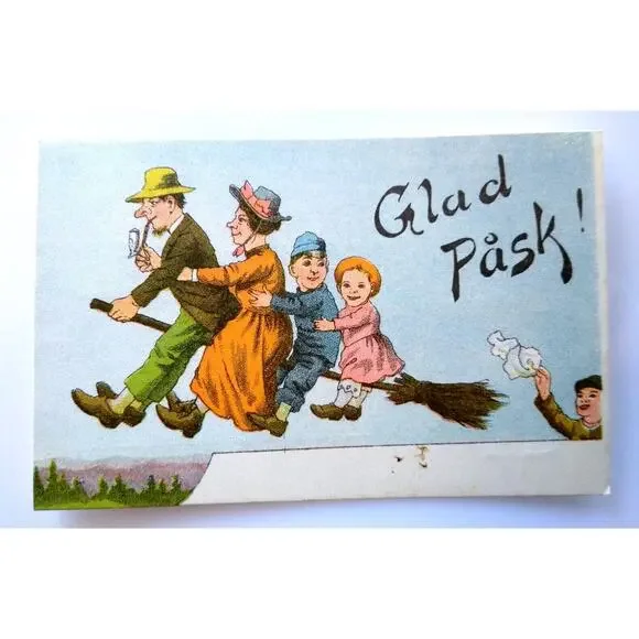Easter Witch Postcard Fantasy Glad Pask Husband Wife Kids Flying On Broom Sweden
