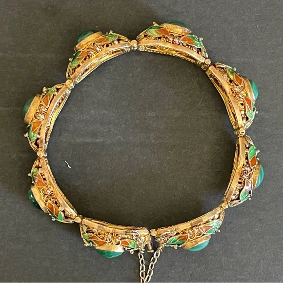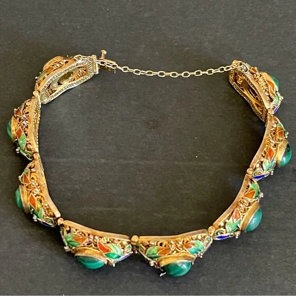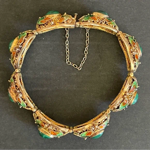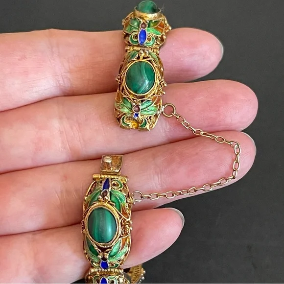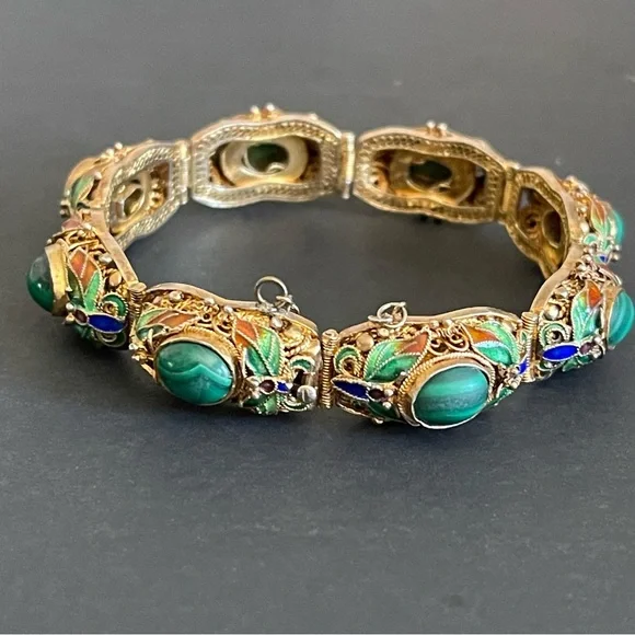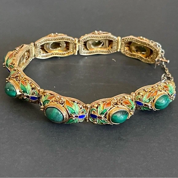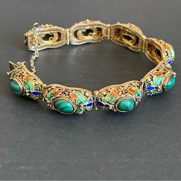 Vintage Chinese export malachite and enamel filigree bracelet.