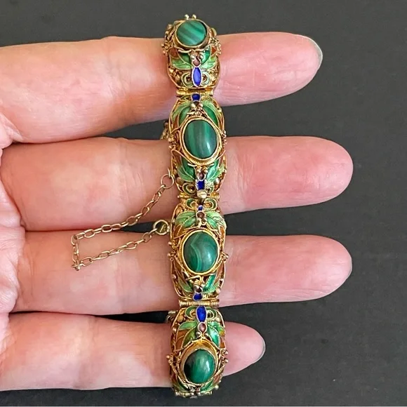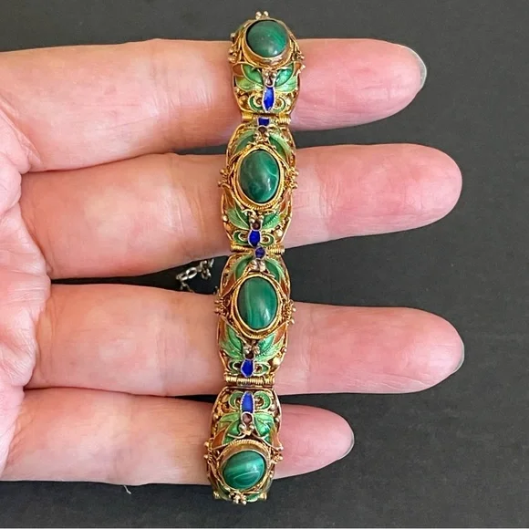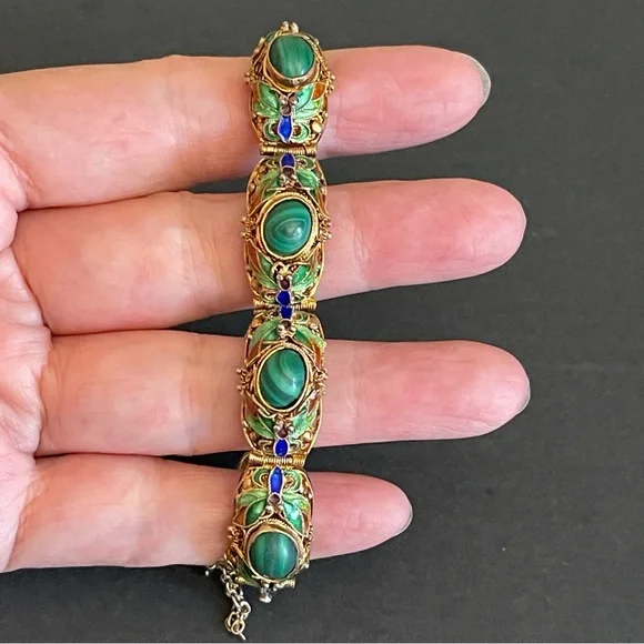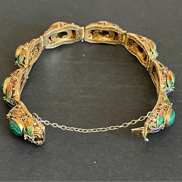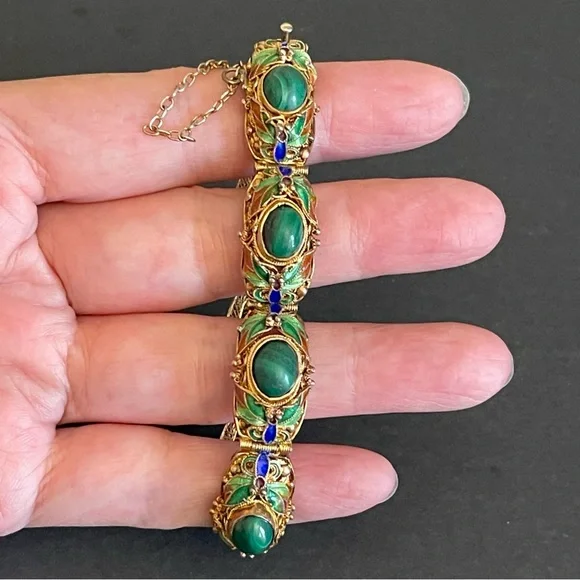 Vintage Chinese export malachite & enamel filigree bracelet.Very good vintage condition.Approx bracelet length:7”inches.Approx bracelet width:11mmDisplay coin size 24mmSterling stamped on clasp.see last picture.#40