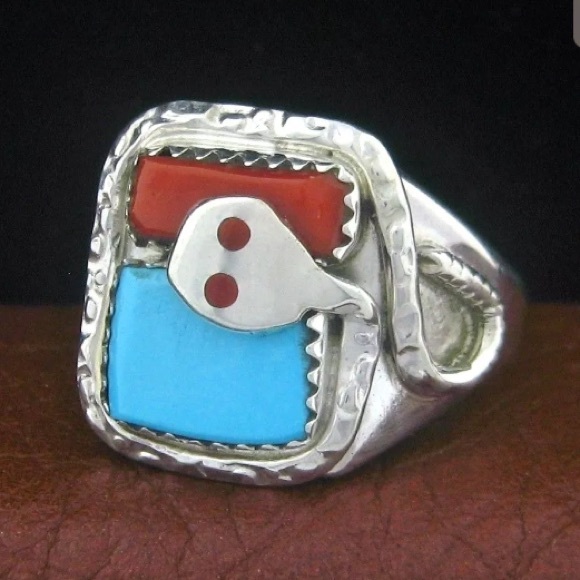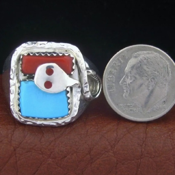 This Classic Sterling Silver Traditional rare Sleeping Beauty Turquoise and Coral Snake Ring is one of a kind, Native American handmade. Created By Zuni Artist Effie Calavaza, the...