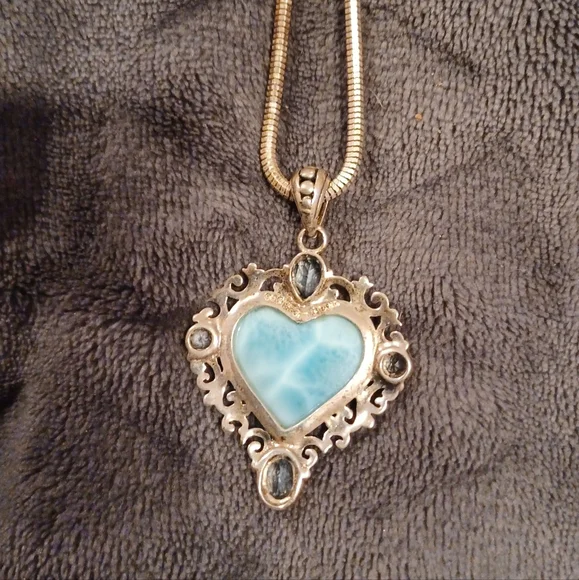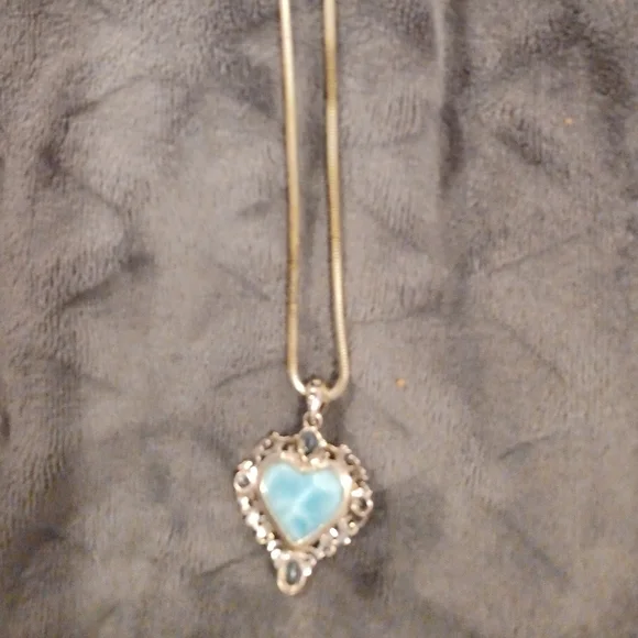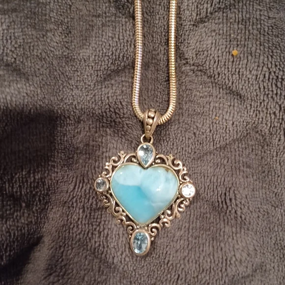 Larimar Heart shaped stone with 2 Sky Blue Topaz stones & 2 Aquamarine stonespendant with a 20 inch sterling silver snake chain which it did not come with this chain but it is included. Larimar is one of the rarest minerals on this planet. It is found in one place in the Dominican Republic on a mountain called Bahoruco. That is the only place that it is sourced. That is why it is so rare. It is a beautiful blue with very little white marbling in it. It is a very beautiful necklace. This is a kitty friendly home. This is a smoke free home.