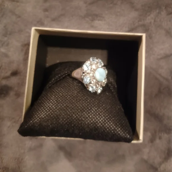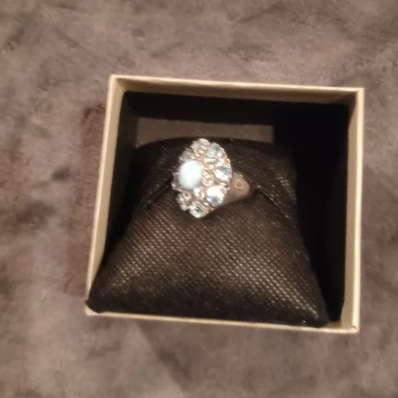 Larimar, Aquamarine & Blue Topaz ring. Size 7. There is a round larimar stone in the center. There are 8 round Aquamarine gemstones around the larimar stone. There are 8 heart shaped Blue Topaz gemstones around the Aquamarine stones.. Larimar is sourced from one place in the Bahoruco mountain of the Dominican Republic. The ring is in a flower shape. This ring is esquisite. This is a kitty friendly home. This is a smoke free home.
