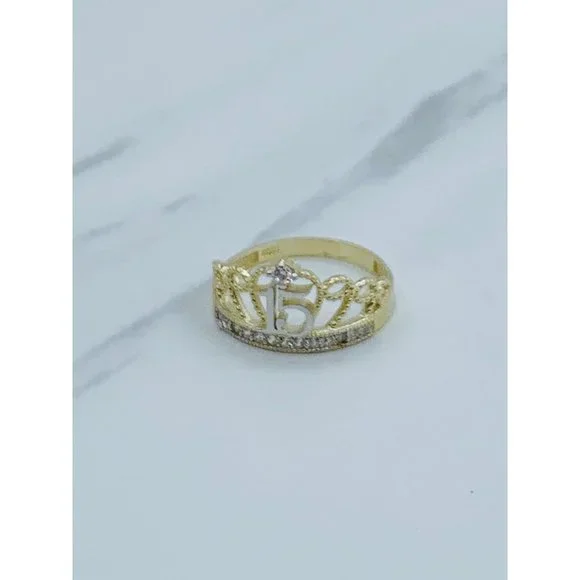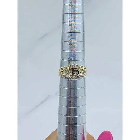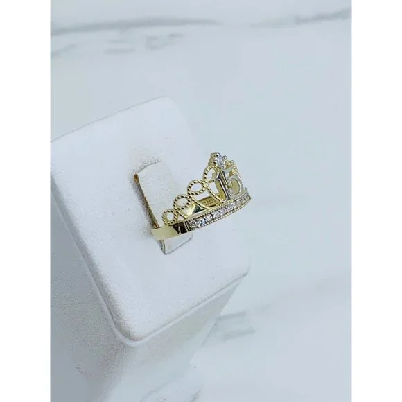 10k solid gold ring sweet 15 crown tiara ❤️ yellow and white gold with white cubic zirconia❤️ Size 8❤️ New Jewelry ❤️ includes a small box Check out my other jewelry ************❤️ Anillo de quince años de 10 Kilates oro sólido ❤️ Tamaño 8❤️ Anillo de corona ❤️ Joyeria Nueva❤️ Oro dorado con piedra blanca Stock #081473
