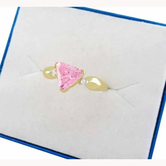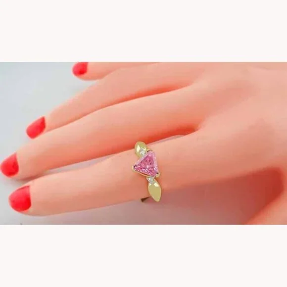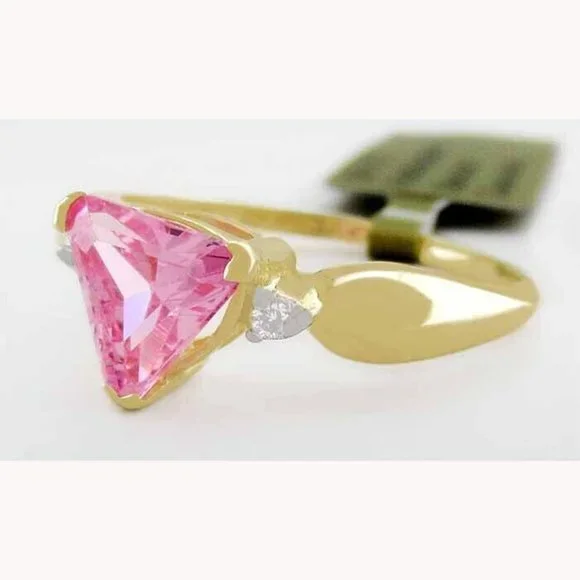 Material: 10K yellow goldShape: trillion & roundRing Size: 6.5 (resizing available, please read below)Net weight: 2.1 gramsGem type: 1 lab created Pink Sapphire - 1.75 caratsPink...