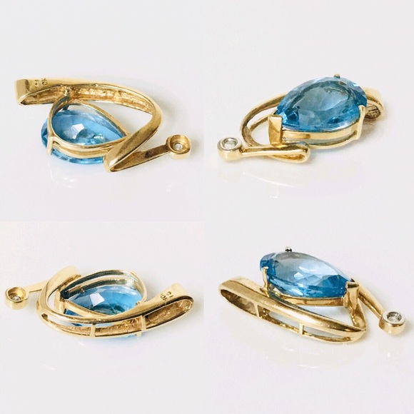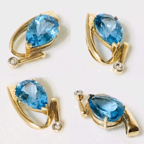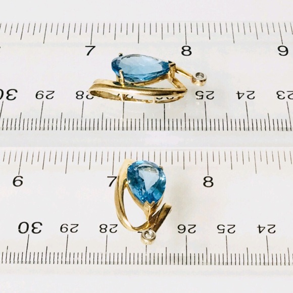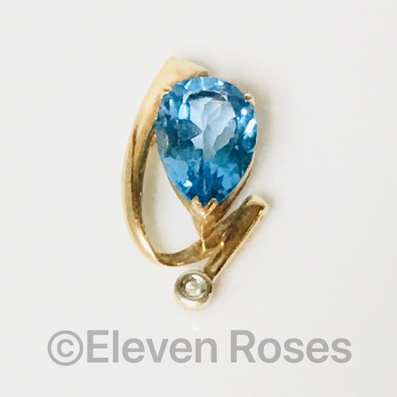 Large 10k Gold Blue Topaz & Diamond Slide Pendant -Solid 10k Yellow Gold-Hallmarked 10k-Pear Cut Blue Topaz Gemstone Measures Approx 15mm L X 10mm W-Bezel Set Diamond Accent...