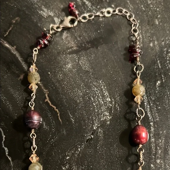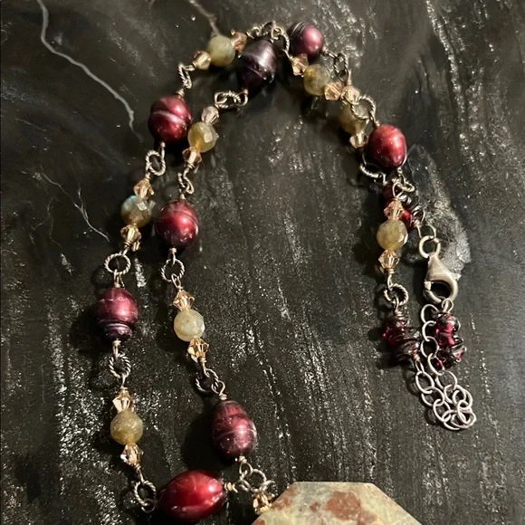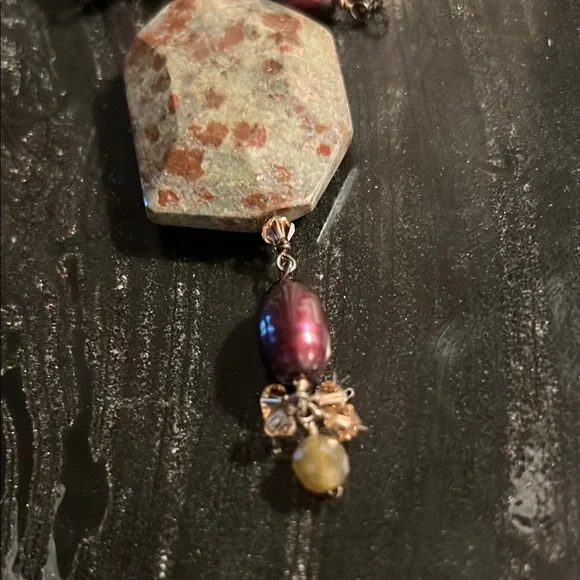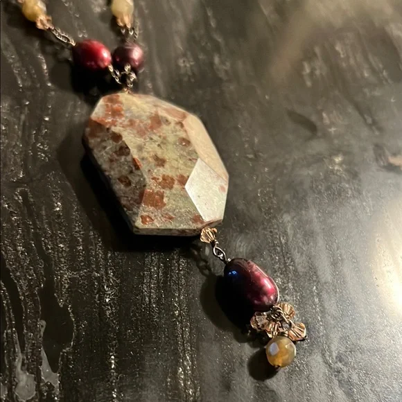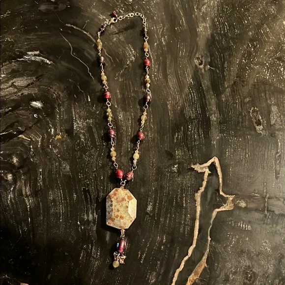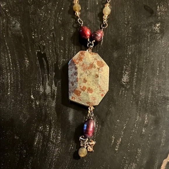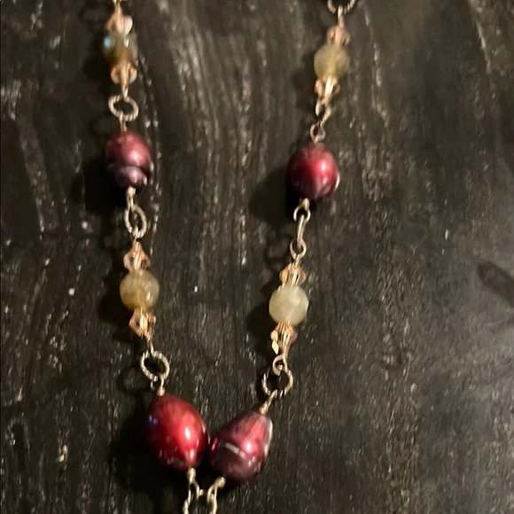This elegant necklace features a stunning combination of red and purple-ish beads, with the main stone in turquoise, all linked together by a copper colored chain. Purchased from...