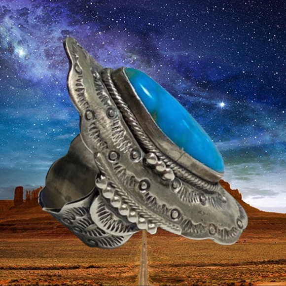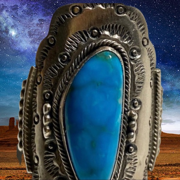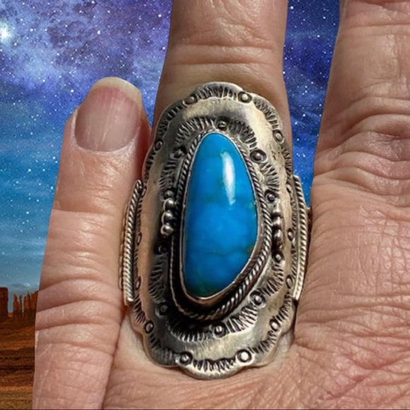 Sterling silver stampwork ring from the 1970´s from Running Bear. Set with a gorgeous piece of turquoise. Size 8.5. Length at the front, from top to bottom is 1 5/8 inches....