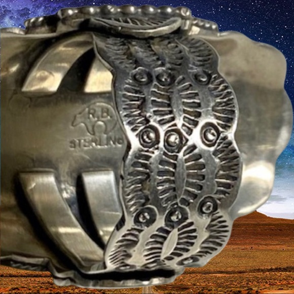 Sterling silver stampwork ring from the 1970´s from Running Bear. Set with a gorgeous piece of turquoise. Size 8.5. Length at the front, from top to bottom is 1 5/8 inches. Weight is 15 grams.